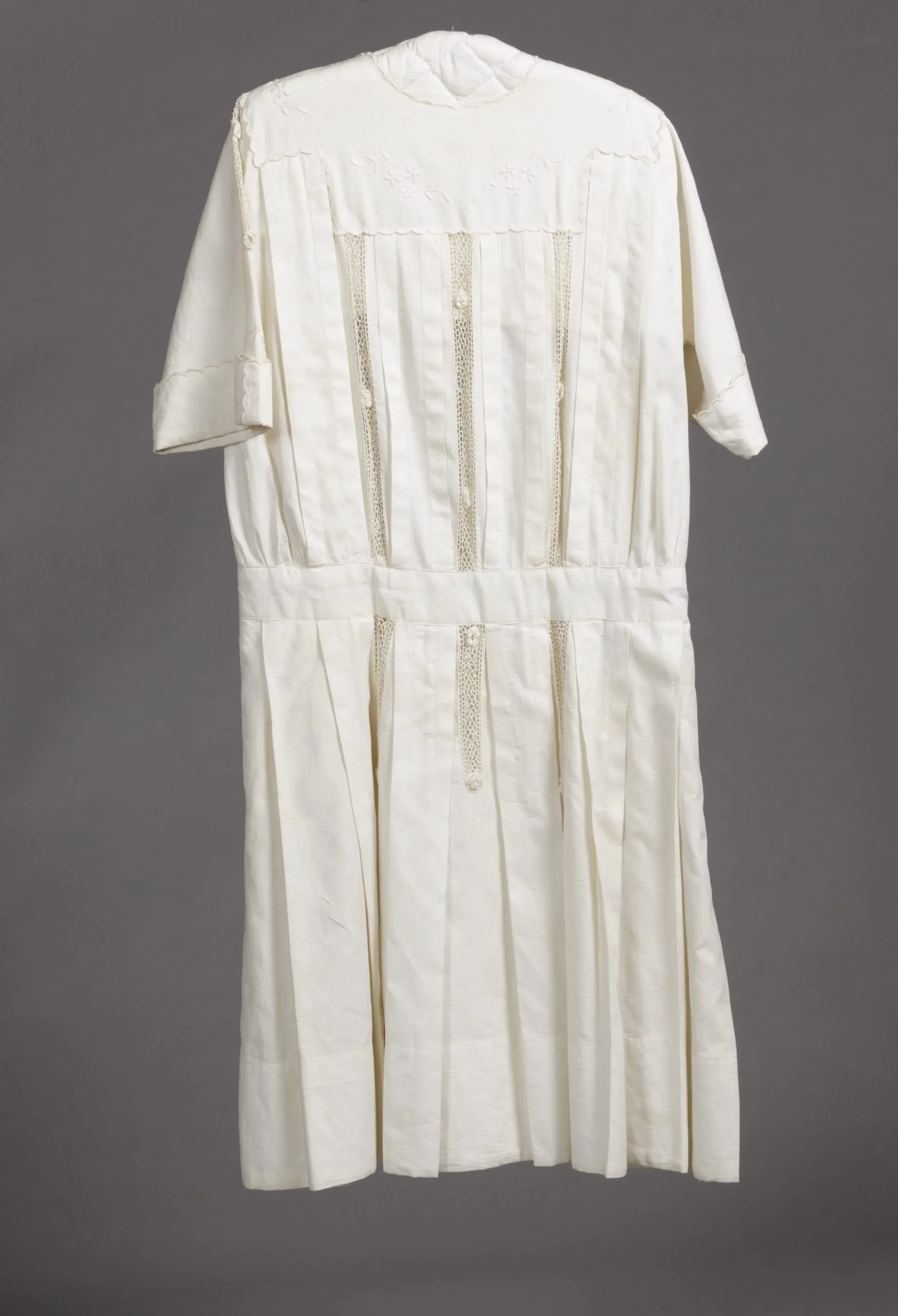 - Cotton plain weave with supplementary weft with cotton lace inserts and cotton embroidery