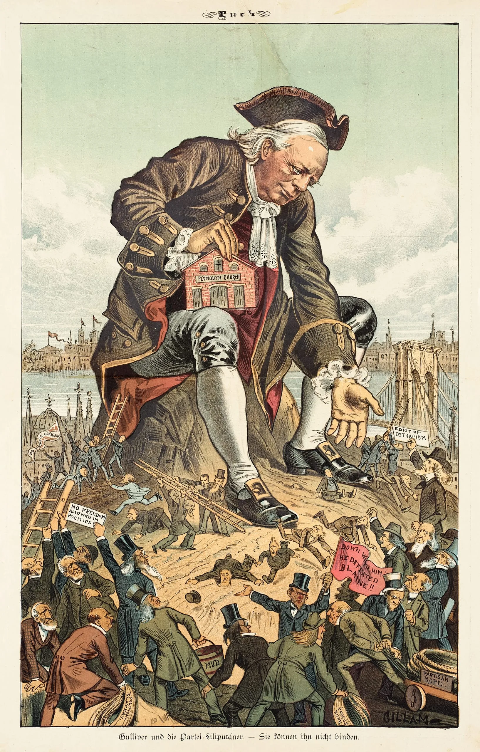 Color chromolithograph from Puck magazine showing a giant man in 18th-century dress towering over a crowd of tiny figures pulling ropes around his feet, with a city skyline in the distance
