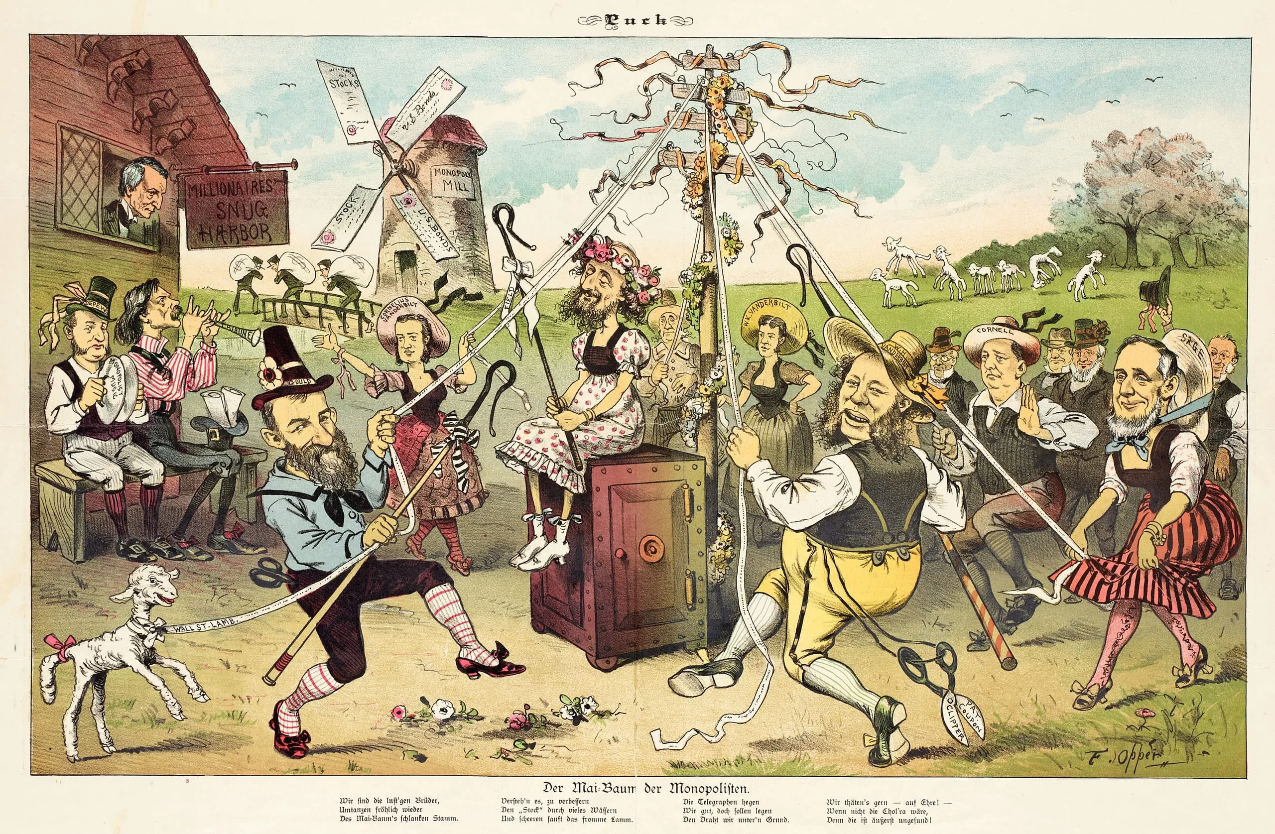 Color satirical print, a crowd of caricatured figures in 19th-century dress dance around a maypole set atop a iron safe, labeled 'Der Mai-Baum der Monopolisten,' with German verse below
