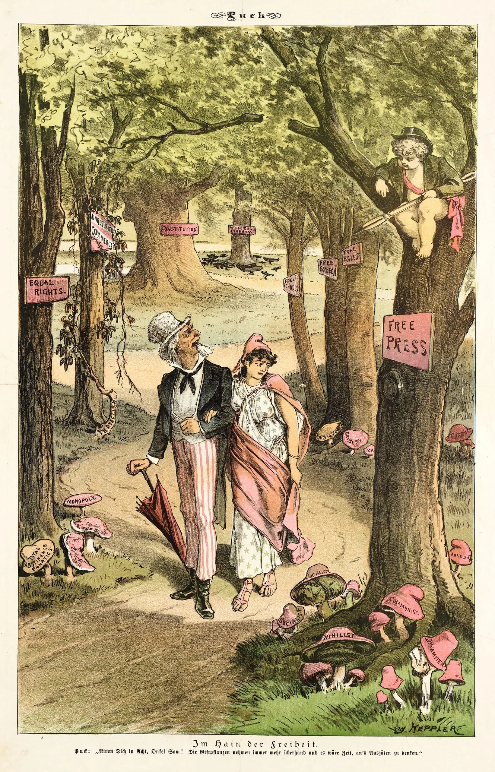 Color editorial print depicting Uncle Sam and a draped female figure walking a wooded path lined with signs reading 'Equal Rights,' 'Free Press,' and 'Constitution,' with pink mushrooms labeled 'Monopoly' and 'Anarchy' on the ground
