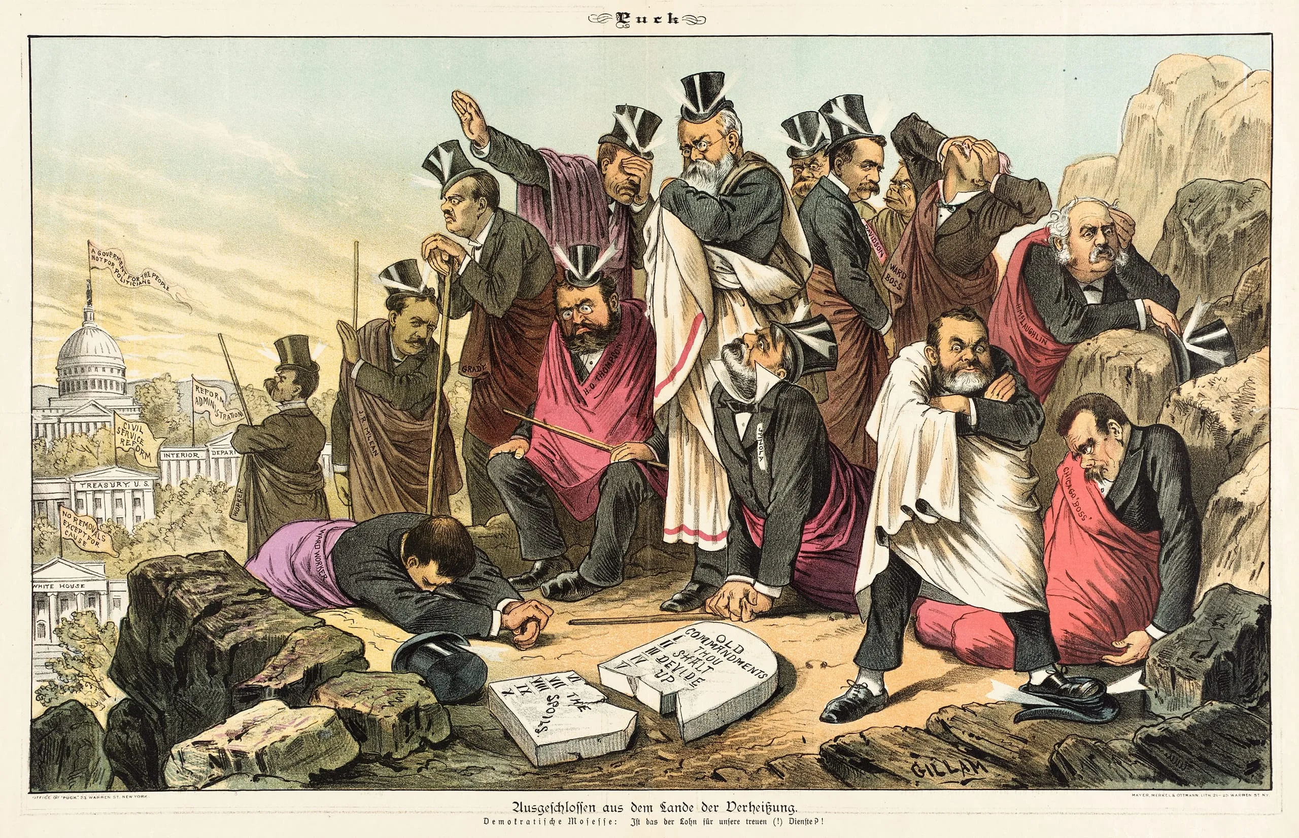 Color lithograph from Puck magazine showing a crowd of robed, top-hatted men on a rocky ledge gazing toward a distant Capitol building, with stone tablets and a prostrate figure in the foreground