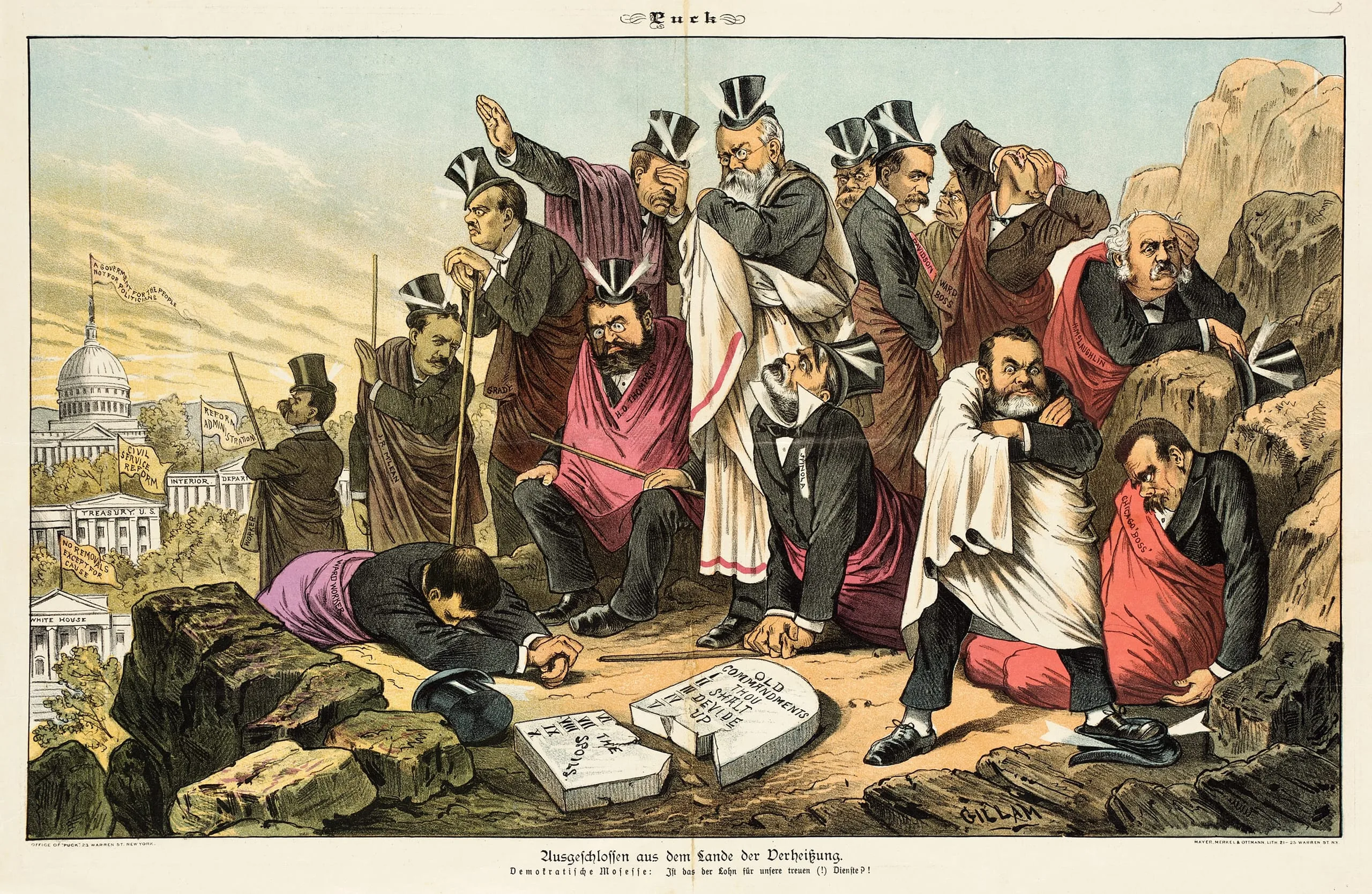 Color chromolithograph from Puck magazine showing a crowd of caricatured men on a rocky ledge, with the U.S. Capitol in the distance and broken stone tablets at their feet; German caption below
