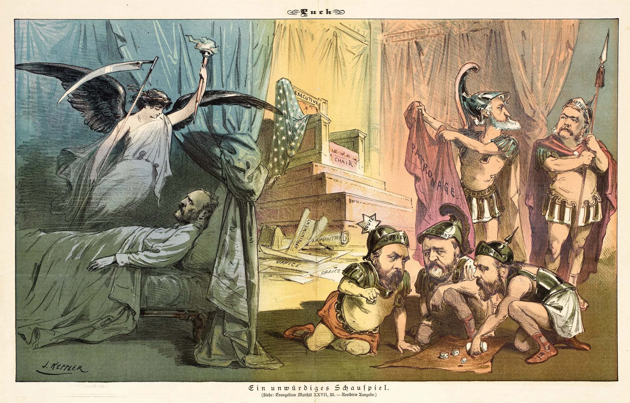 Color lithograph from Puck magazine, split into two scenes: left shows a winged figure with a scythe over a bedridden man; right shows bearded men in Roman armor crouching over dice or coins