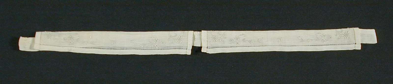 Two narrow ivory-white embroidered fabric bands with hemstitched borders and scattered floral motifs, laid horizontally against a gray background