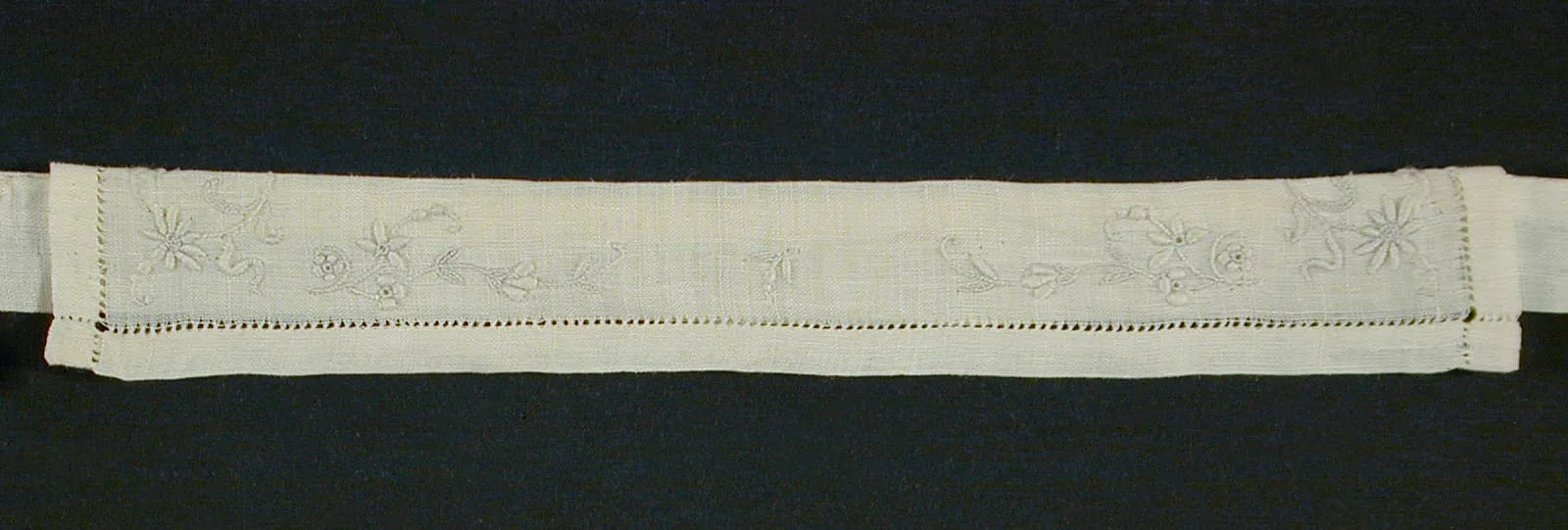 Narrow white linen band with white-on-white embroidered floral motifs including stylized flowers and leaves, bordered along one edge with a row of small drawn-thread eyelets.