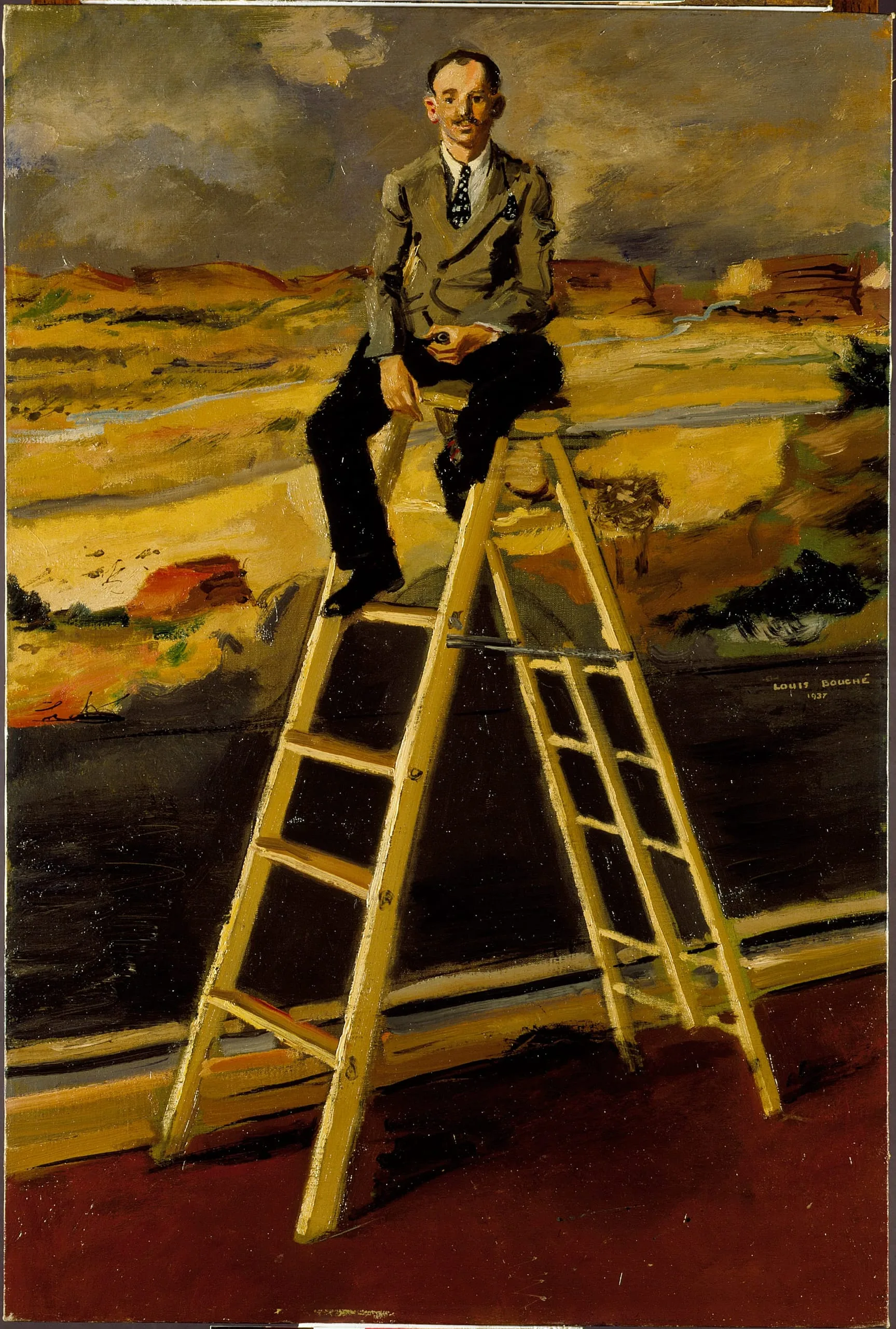 According to Bouché’s daughter, she was supposed to pose for this painting but became dizzy and was replaced by her uncle, Milton Wright. Published accounts give a different version of the circumstances, however: Bouché, who was always ready to see the humor in ordinary scenes, thought his small brother-inlaw seemed ludicrous sitting atop the ladder and so decided to paint him. Wright is situated before the center of the landscape where several deer are sketched in. The figures of the Native American and White Man overlooking the land in the extreme left of the mural are not included. Nor had Bouché yet drawn in the medallions with the symbols of the Department of the Interior in the border along the bottom of the mural. Its incomplete state gave Bouché the opportunity to paint the landscape background of the easel painting in broad, full strokes. One can see in their application the artist’s love of the sensuous qualities of the medium, which brought life to Bouché’s seemingly drab genre scenes. This is especially true in paintings such as The Mural Assistant, which has a palette limited primarily to quiet grays, beiges, and ochers.