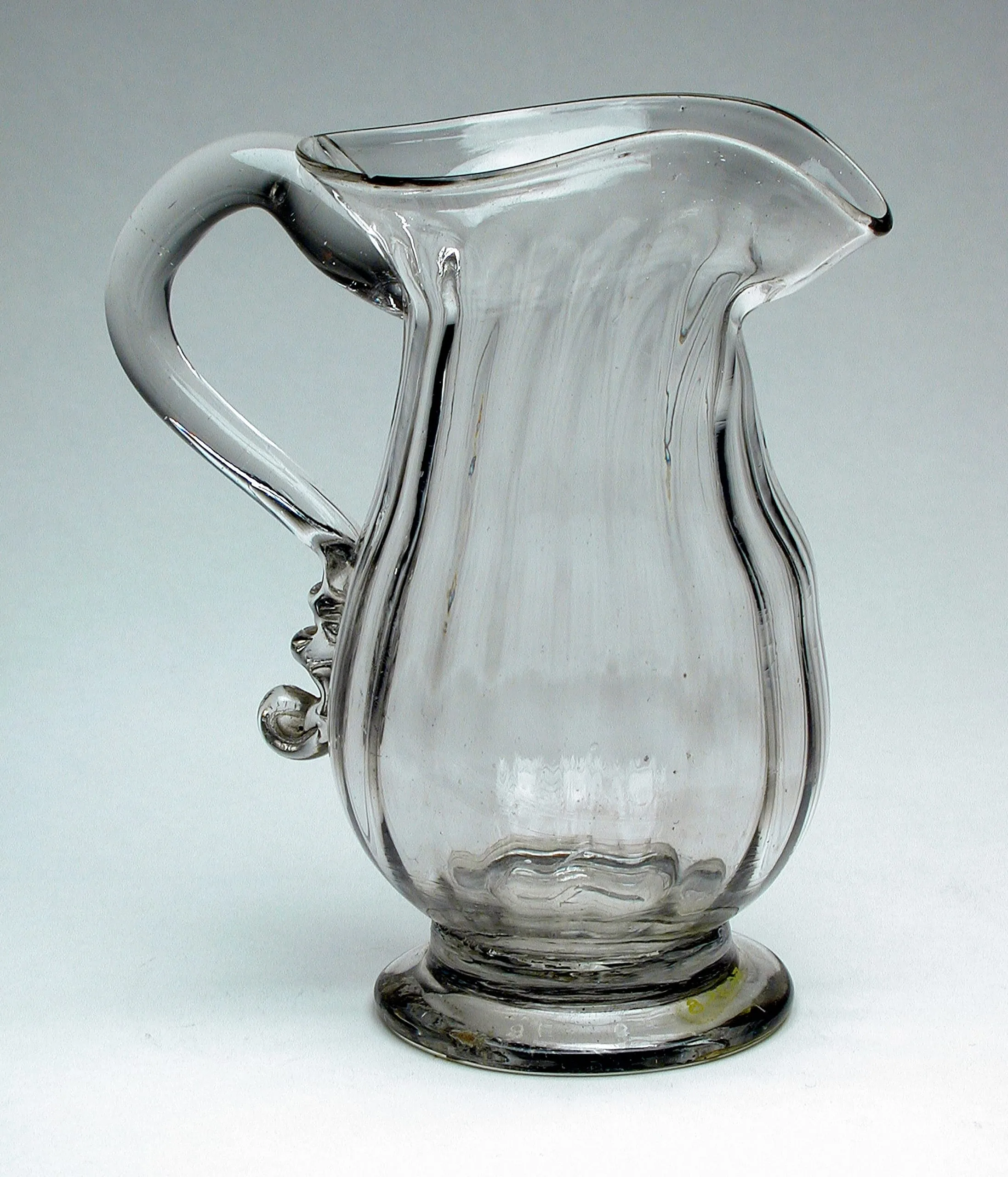 Blown glass pitcher with colorless smoky tint, melon-ribbed bulbous body, pinched spout, arched handle with scroll terminal, and wide disk foot