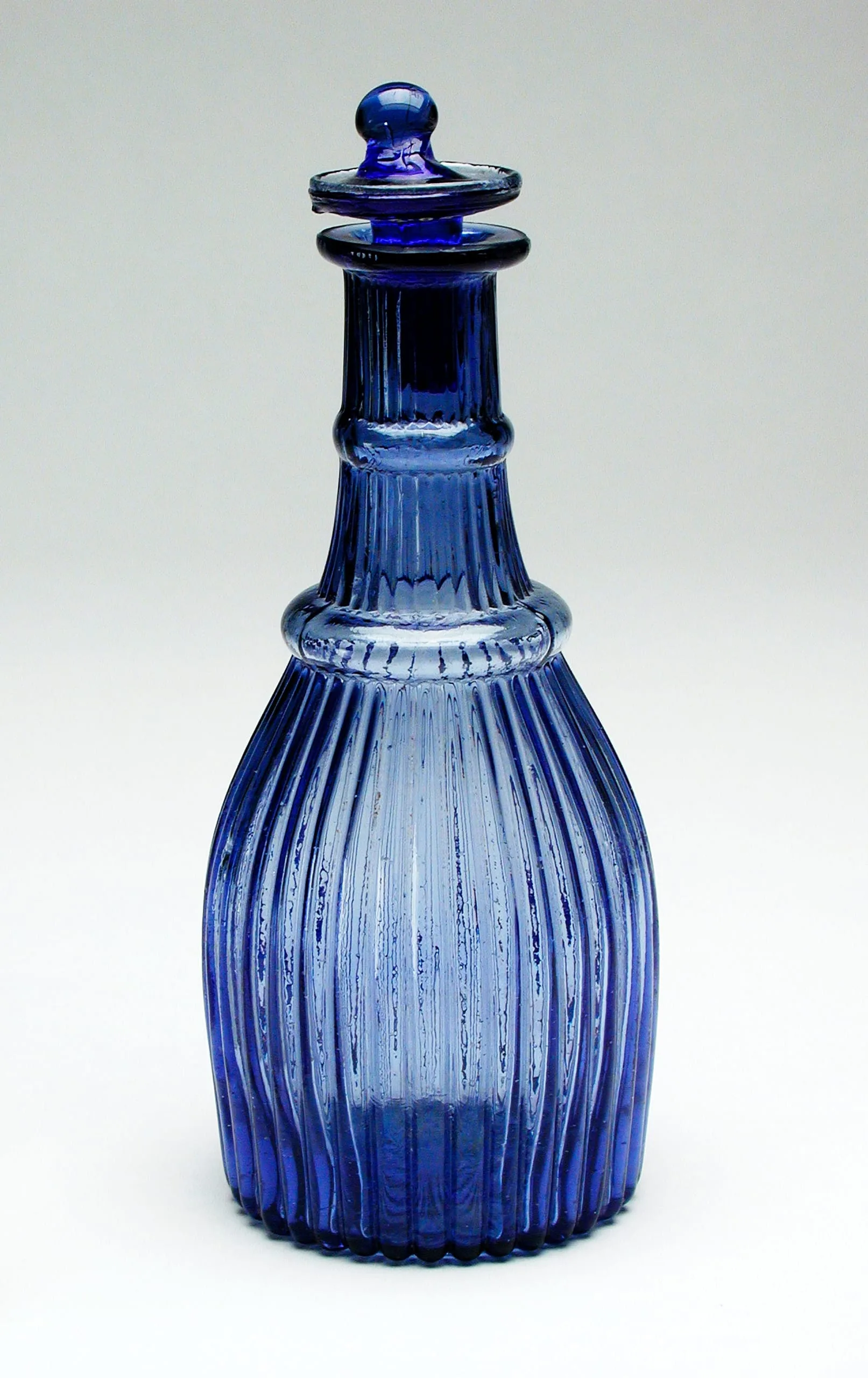 Cobalt blue glass decanter with vertical ribbing, rope-like collar at the shoulder, and original ball-knob stopper
