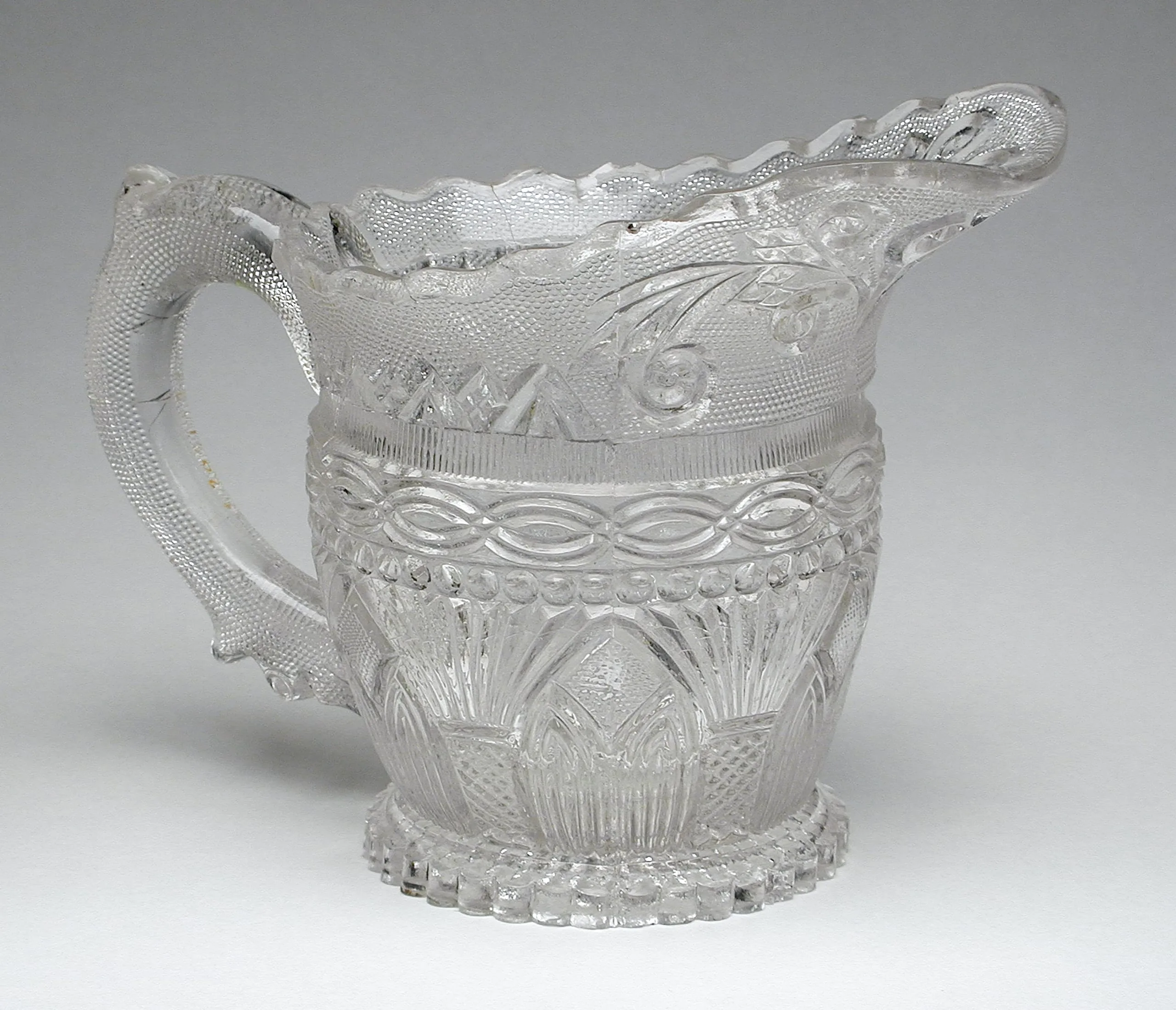 Clear pressed glass pitcher with scalloped rim, C-shaped handle, and multiple horizontal bands of molded decoration including diamond-point texture, interlocking ovals, and fan motifs