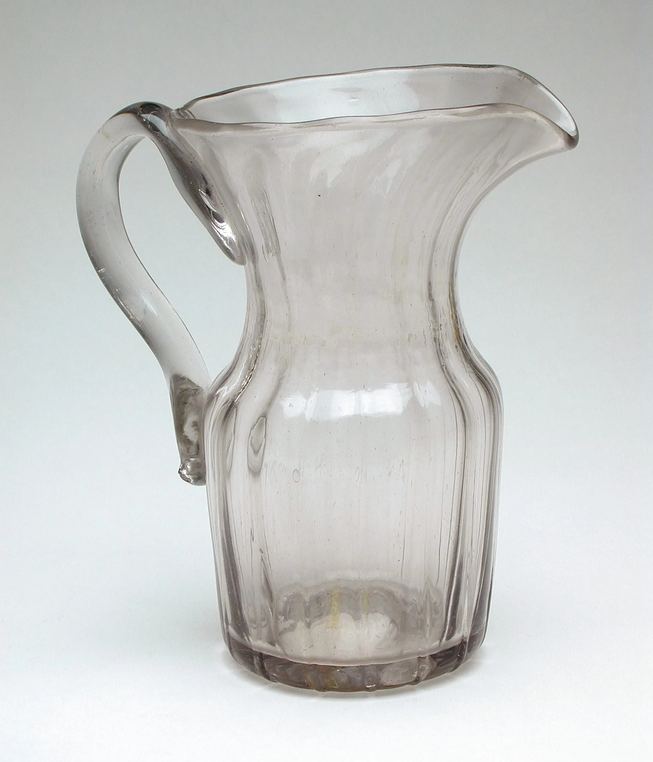 Molded glass pitcher with faceted vertical panels, smoky lavender-gray tint, wide arching spout, and applied loop handle