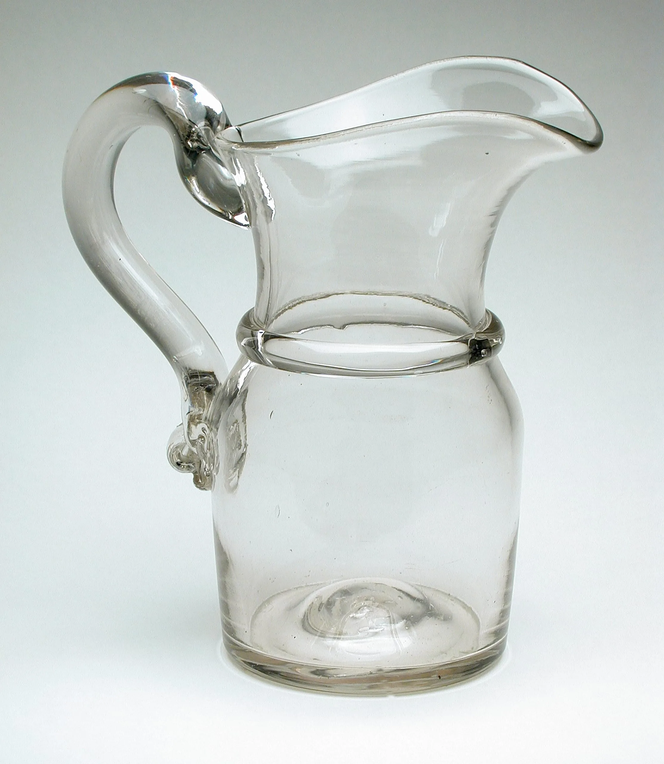 - Jug - Of heavy glass; cylindrical below, with wide flaring spout, a welt at the shoulder, large plain handle crimped below. Probably Pittsburg. Ht. 8 3/8" to handle.