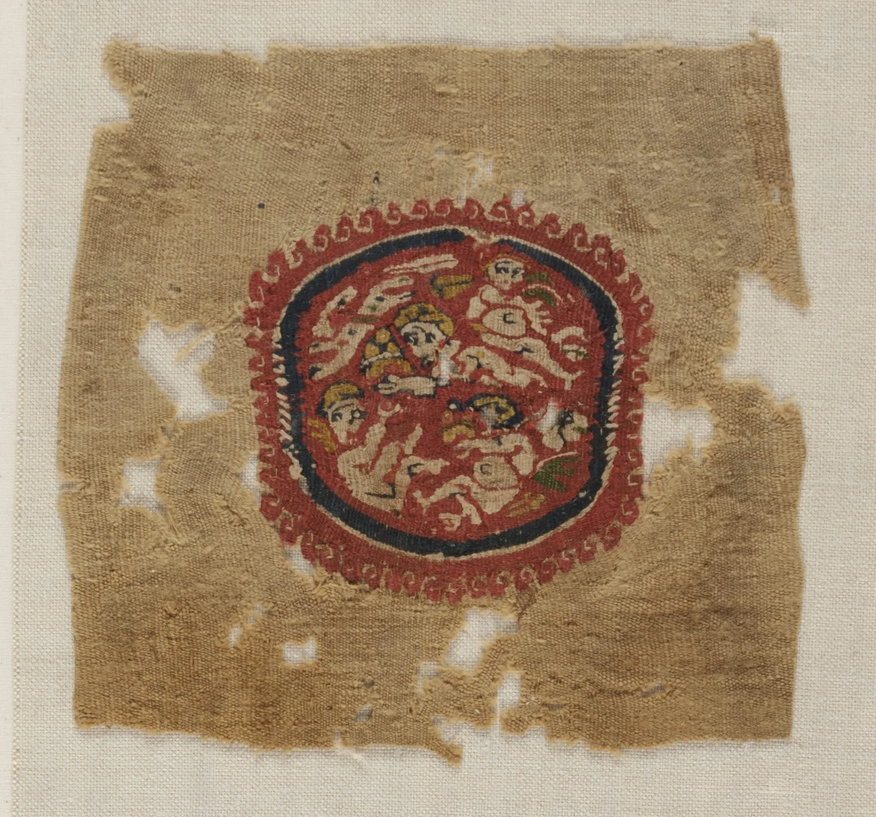 Fragmentary woven textile with a circular tapestry medallion at center, depicting small human figures in red, ivory, and gold against a crimson field, bordered by navy and scroll-patterned rings, on worn tan linen