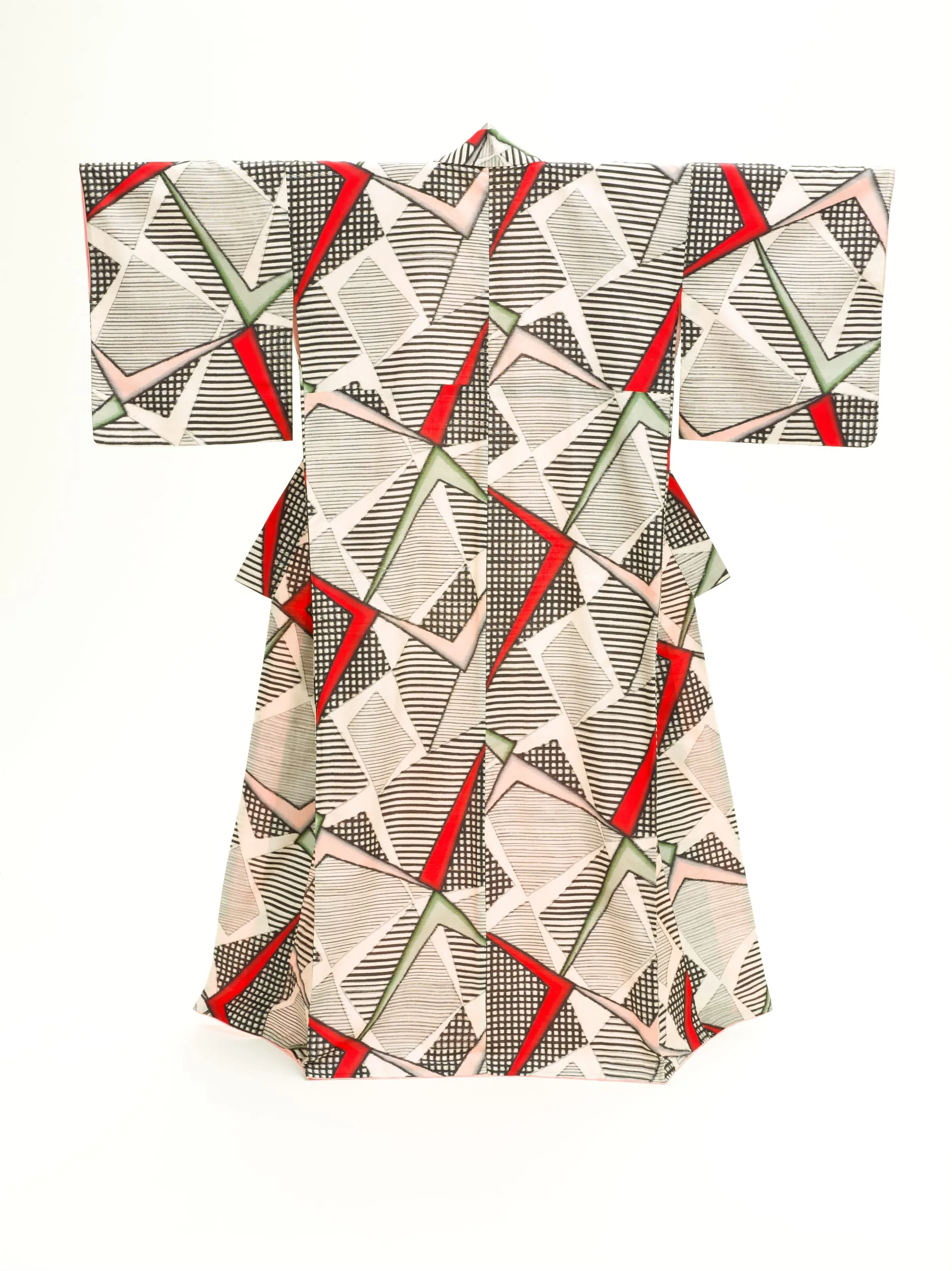 - Silk plain weave, stencil-printed warp and weft, ikat (heiyō-kasuri meisen)
