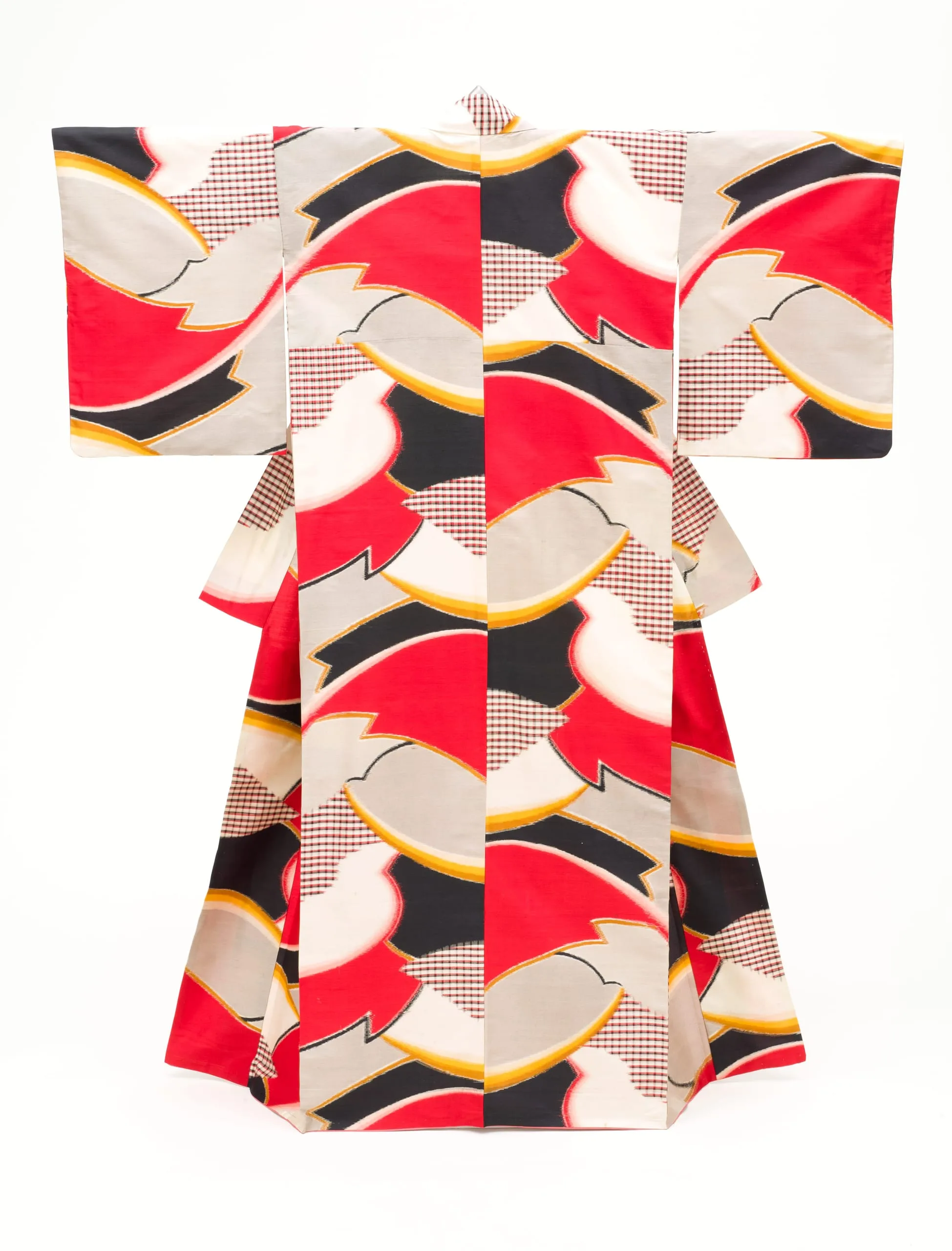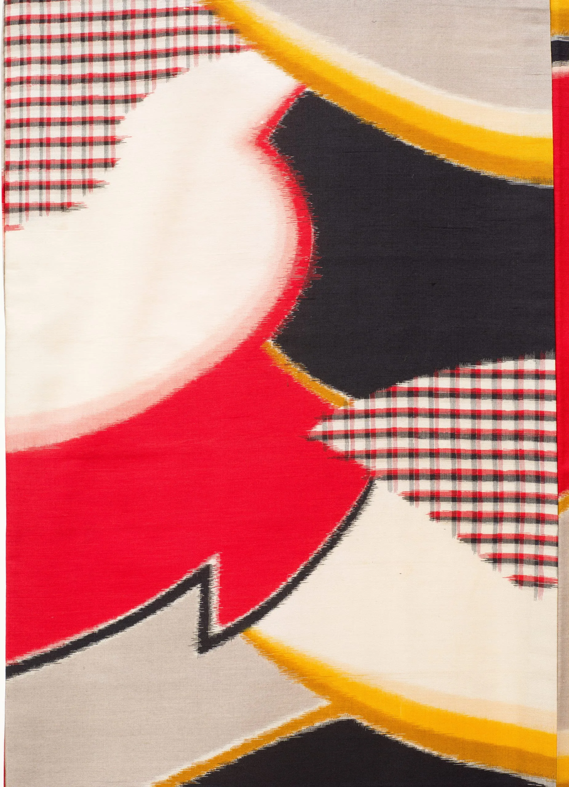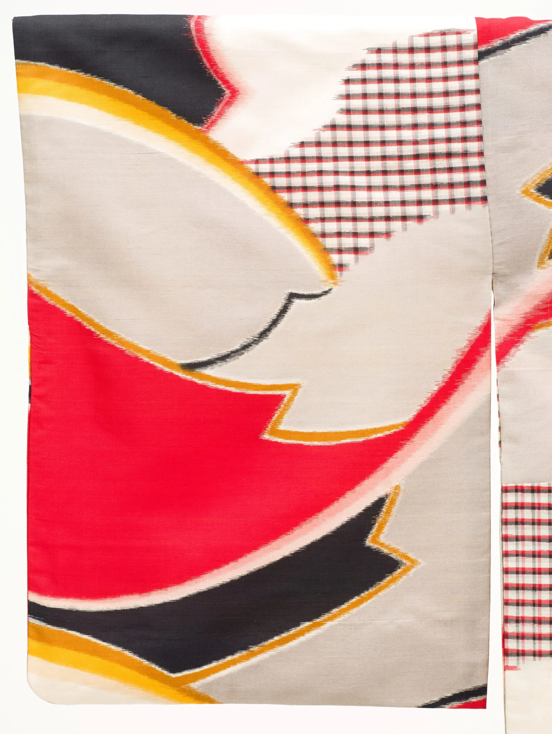 - Silk plain weave, stencil-printed warp and weft ikat (heiyō kasuri meisen)