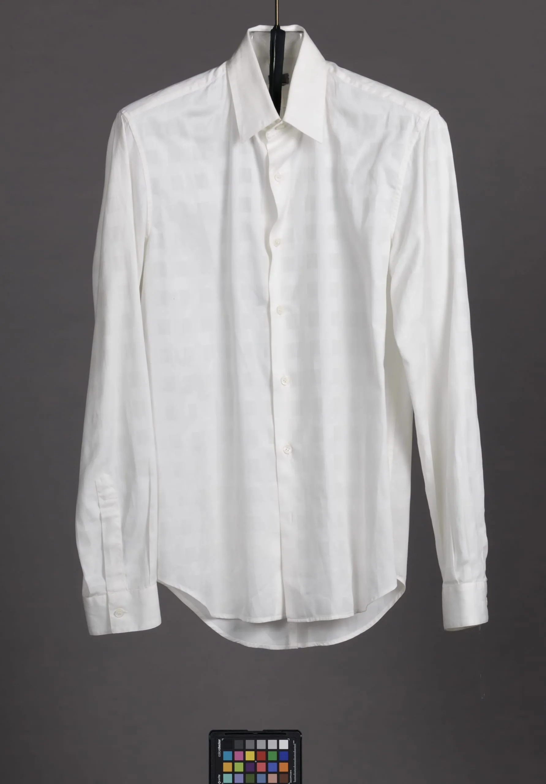 - Jacket: Wool/spandex twill, with polyeurethane, Trousers: Wool and silk plain weave, Shirt: Cotton plain weave and twill, Tie: Wool and silk plain weave, Shoes: Leather