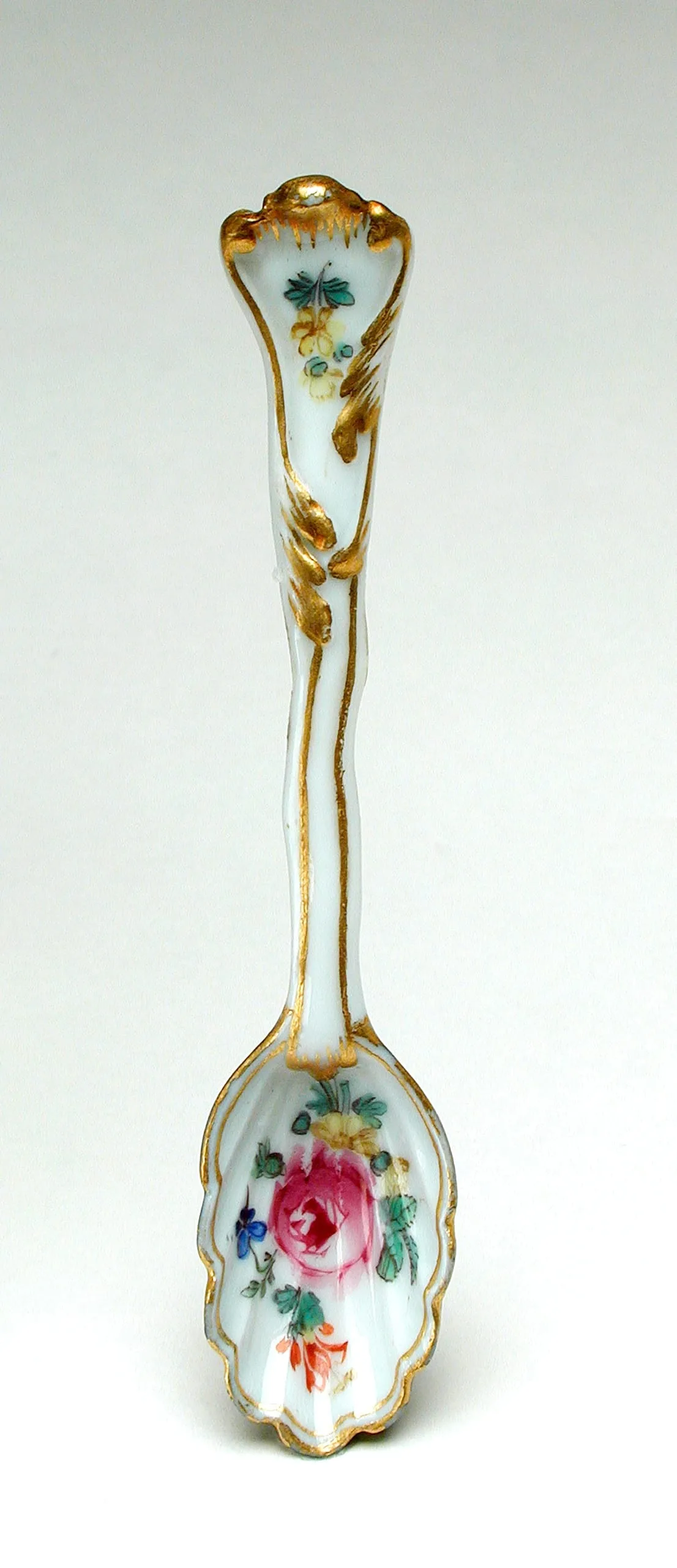 Porcelain spoon with gilded edges, molded rope-twist handle, and hand-painted floral bouquets in rose-pink, teal, and orange on a white ground