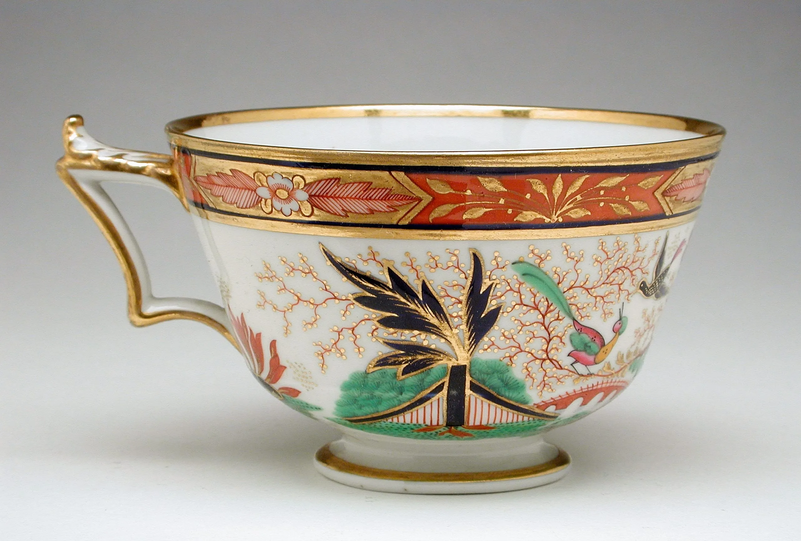 Porcelain teacup with white body, wide flared mouth, and gilt foot ring, decorated with a rust-orange and navy border band and a painted Asian-inspired scene of bamboo, coral-red trees, and colorful birds