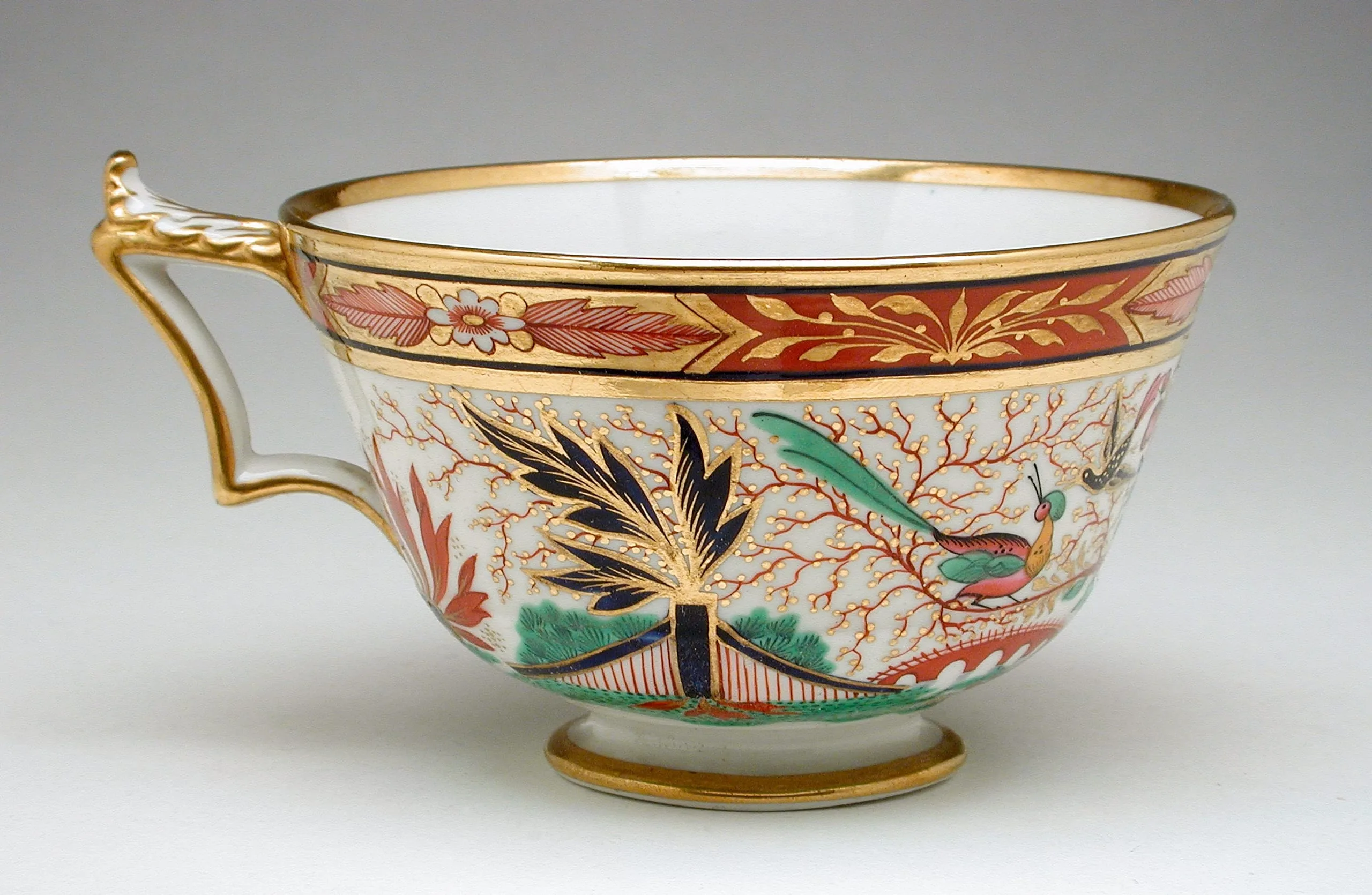 Porcelain teacup with gilded rim and handle, decorated with a brick-red band of gold leaf motifs above a white body painted with chinoiserie scene of a pavilion, palm-like plant, coral branches, and an exotic long-tailed bird