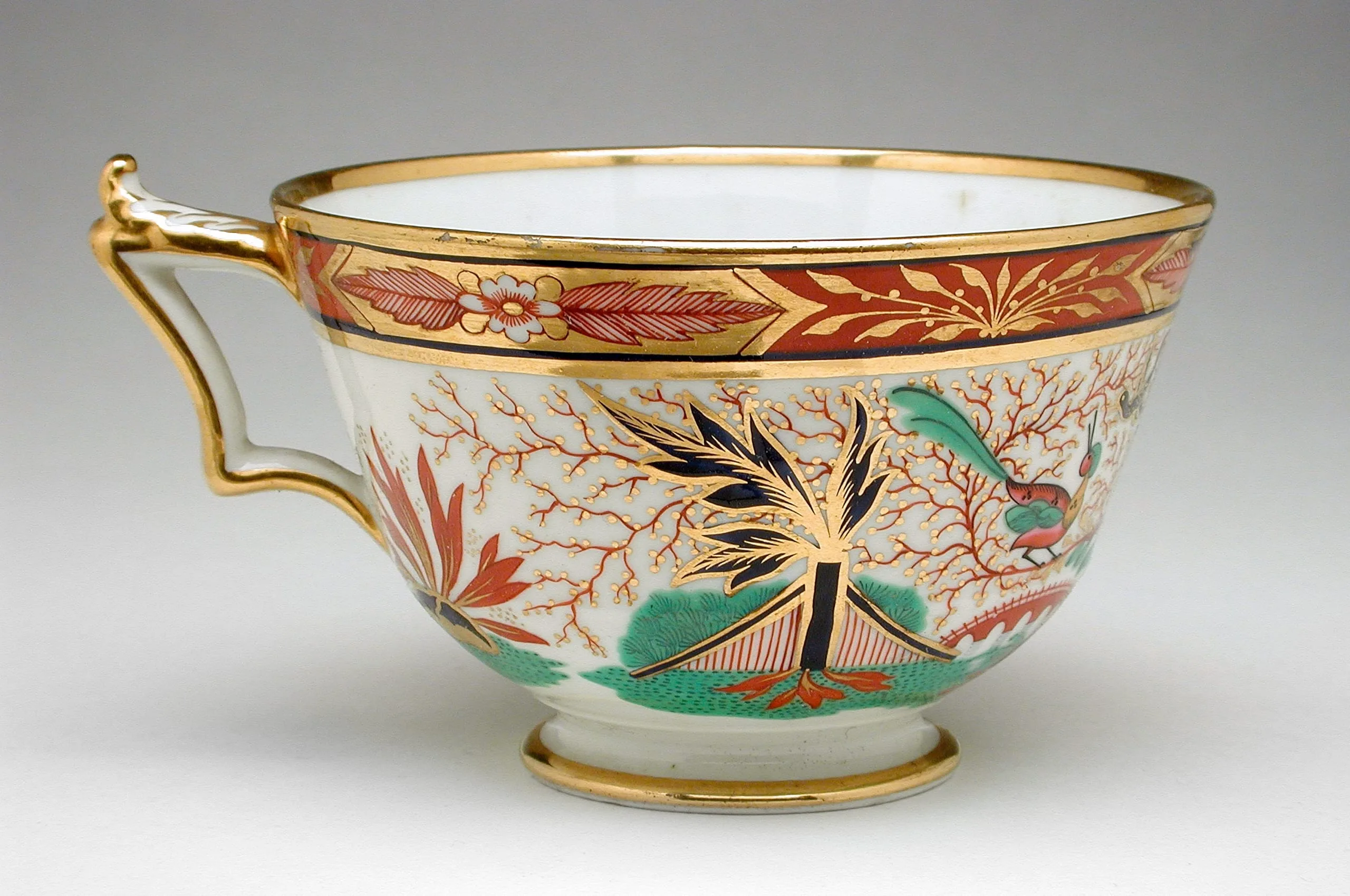 Porcelain teacup with gilded rim and handle, decorated with a brick-red and gold border band above an East Asian-influenced landscape with coral-red branches, a stylized palm, and a colorful bird