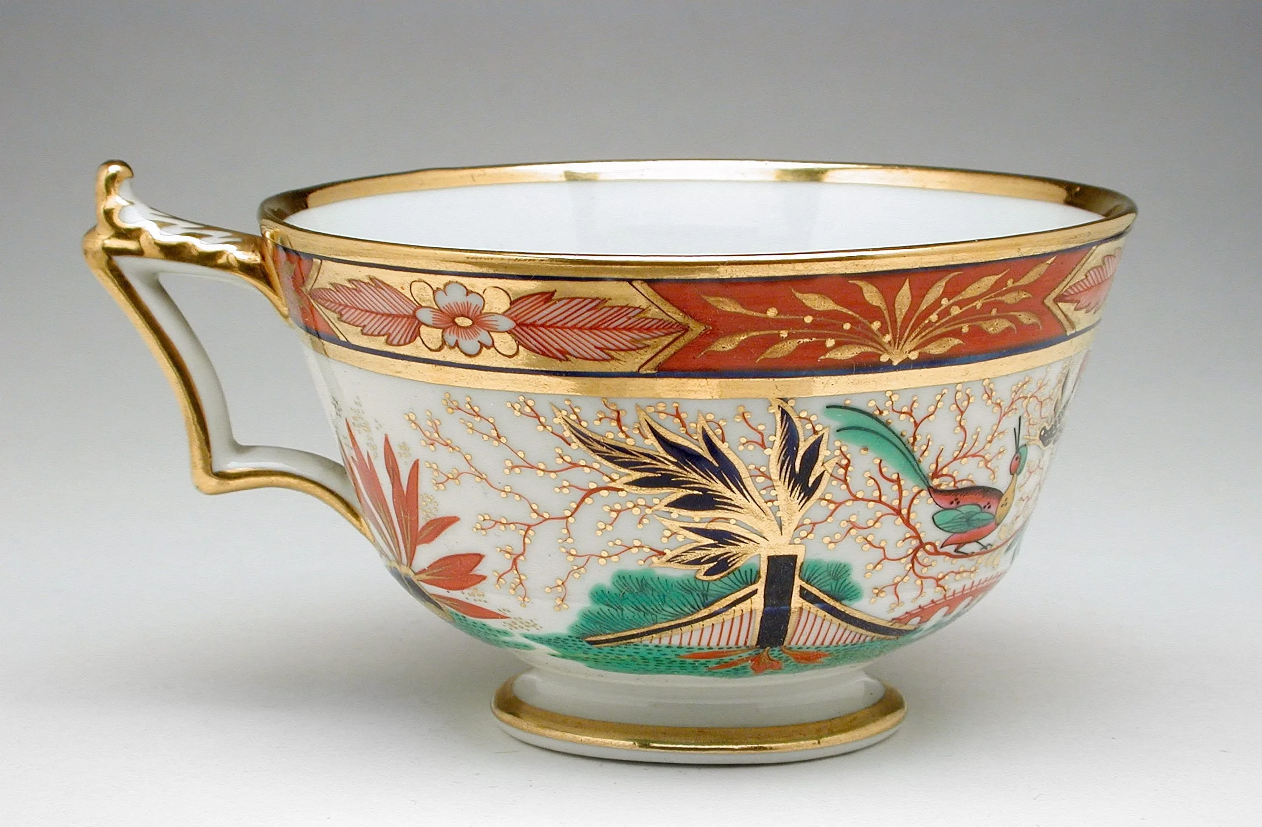 Porcelain teacup with wide flared mouth, gold rim and handle, and painted decoration of bamboo, coral-branch tree, and a small bird on a white ground beneath a brick-red and navy upper border