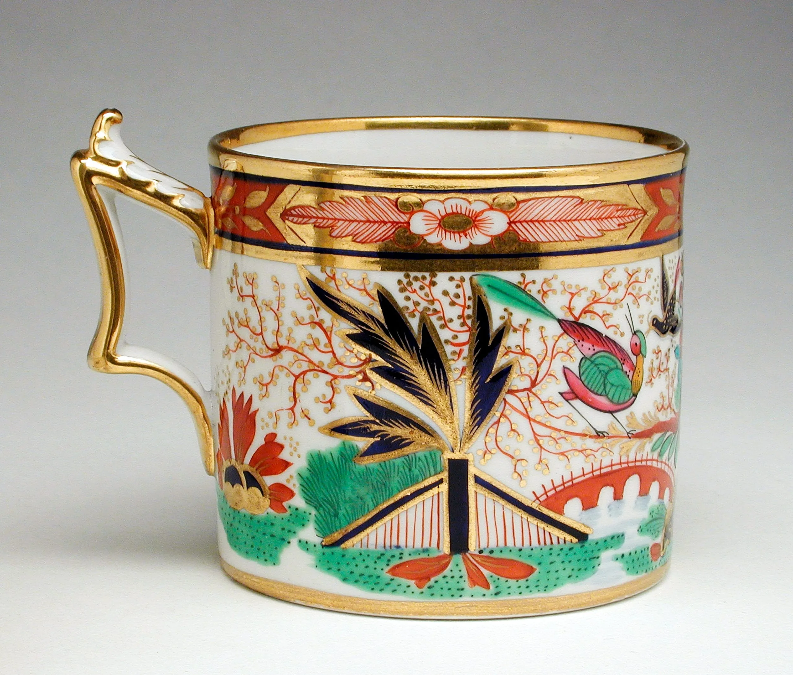 Porcelain can-shaped mug with gilded handle and rim, decorated in chinoiserie style with navy, coral-red, green, and gold motifs including birds, a fanlike plant, and a bridge