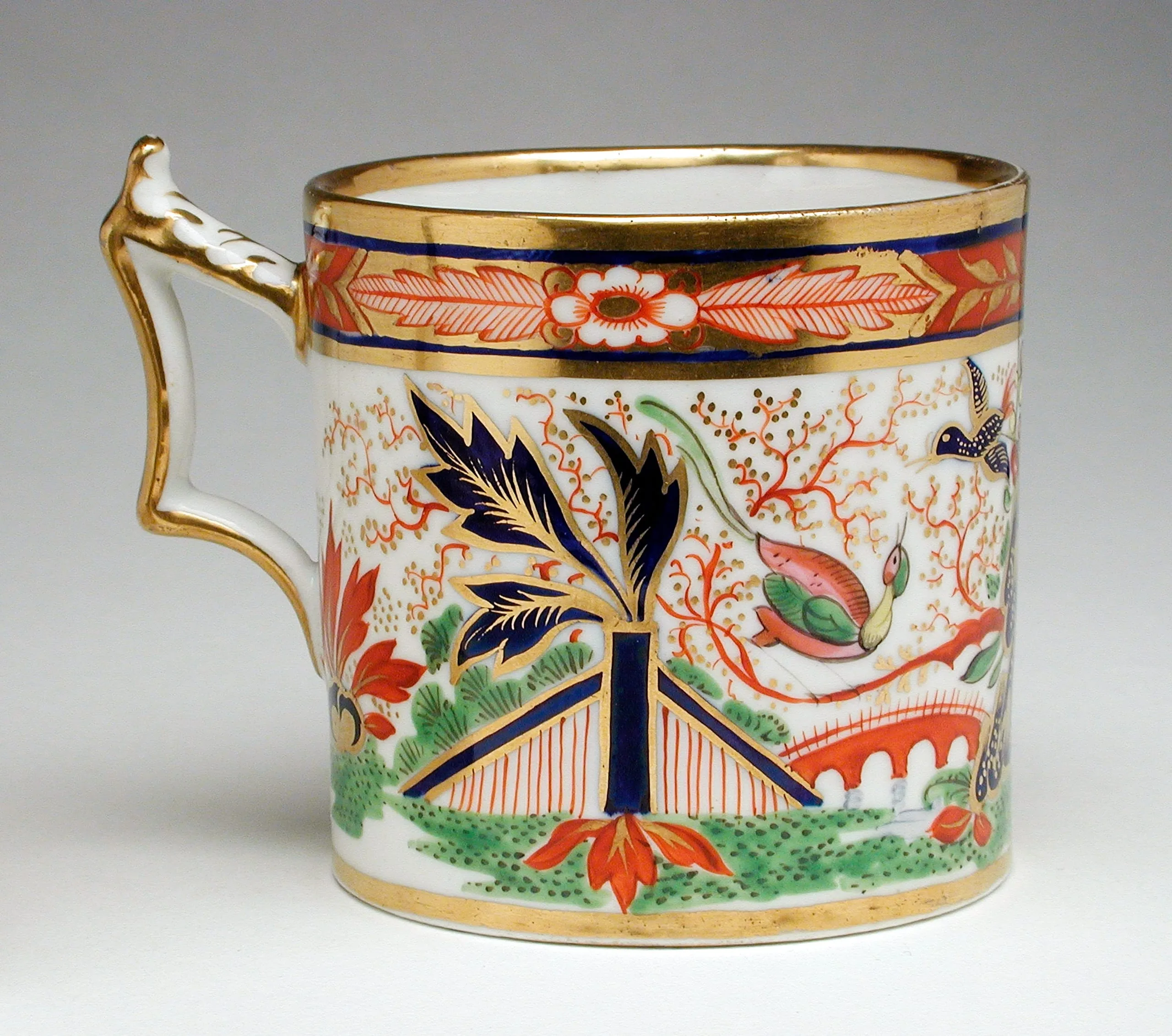 Cylindrical porcelain mug with gilded rim and handle, decorated in the Imari style with cobalt blue, coral-red, and green Asian-influenced garden scene including birds and stylized plants