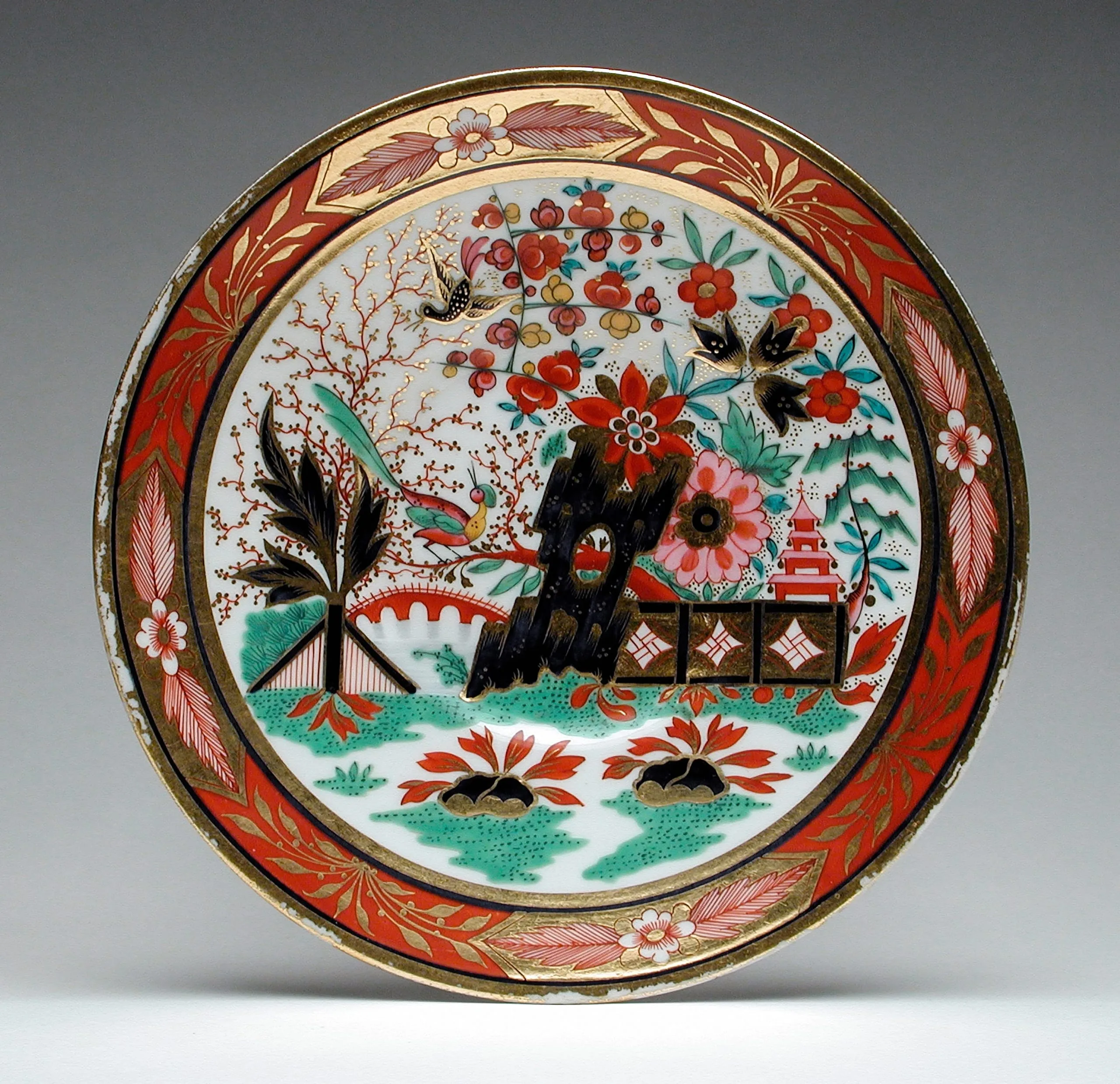 Ceramic plate with polychrome and gilt decoration, featuring a central garden scene with exotic birds, rock formations, flowering trees, and a pagoda against a white ground, framed by a tomato-red rim with feathery leaf and floral panels