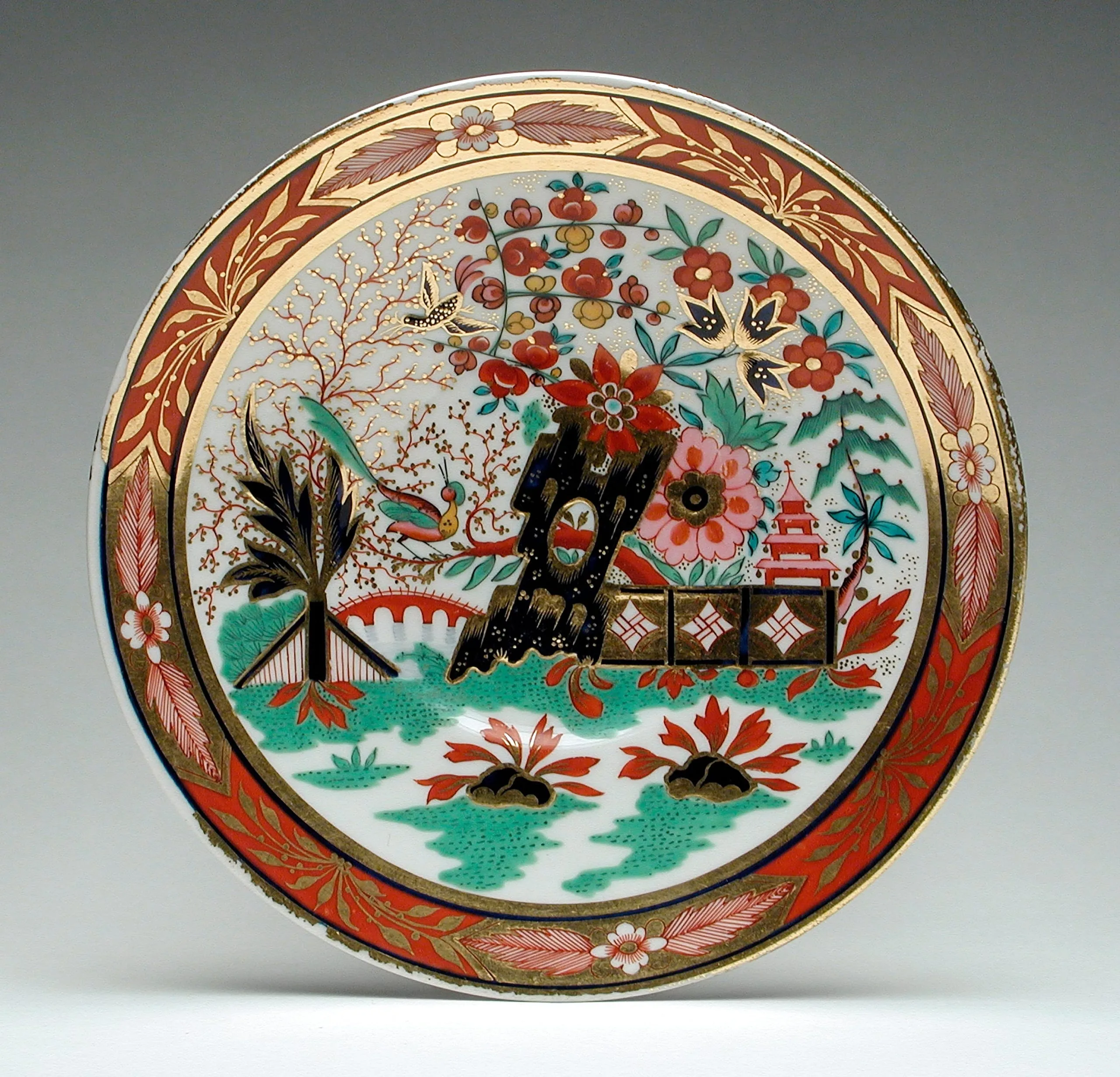 Porcelain plate with wide rim decorated in red and gold panels with leaf motifs; interior well painted with Asian-inspired landscape scene featuring birds, flowering plants, a rock formation, pagoda, and fencing in red, teal, black, and gold enamels.