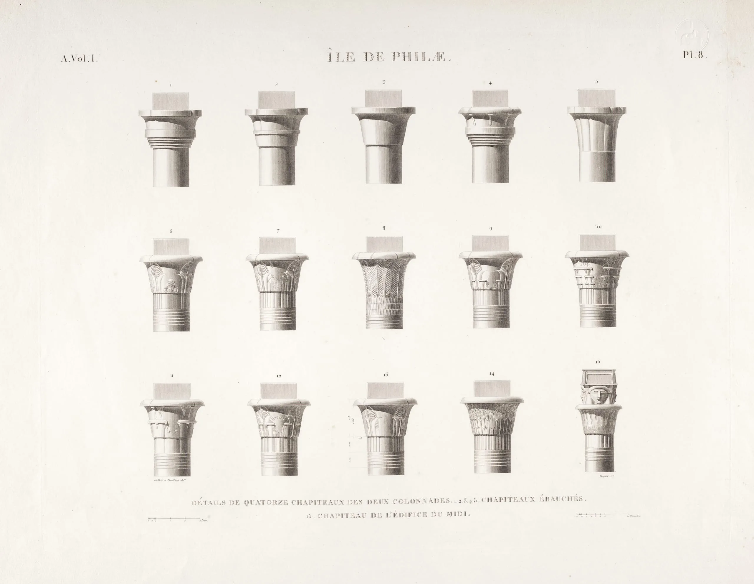 - île de Philæ. Détails de quatorze chapiteaux des deux colonnades. 1.,2,.3,.4.,5. Chapiteaux ébauchés. 15. Chapiteaux de l'édifice du midi.