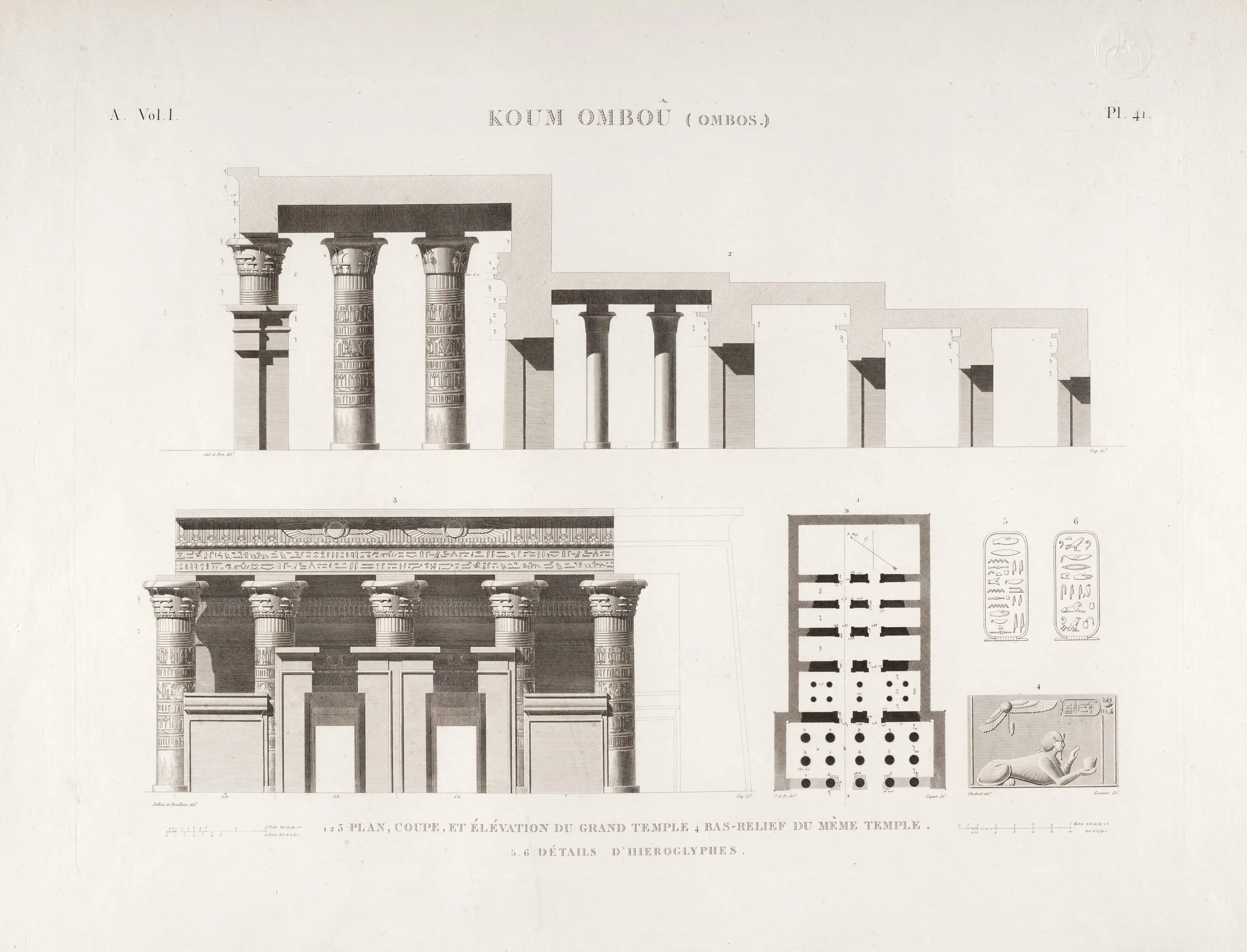 - Ombos. 1. 2. 3. Plan, coupe, et élévation du grand temple 4. Bas-reliefs du même temple. 5.-6. détails d'hieroglyphes.