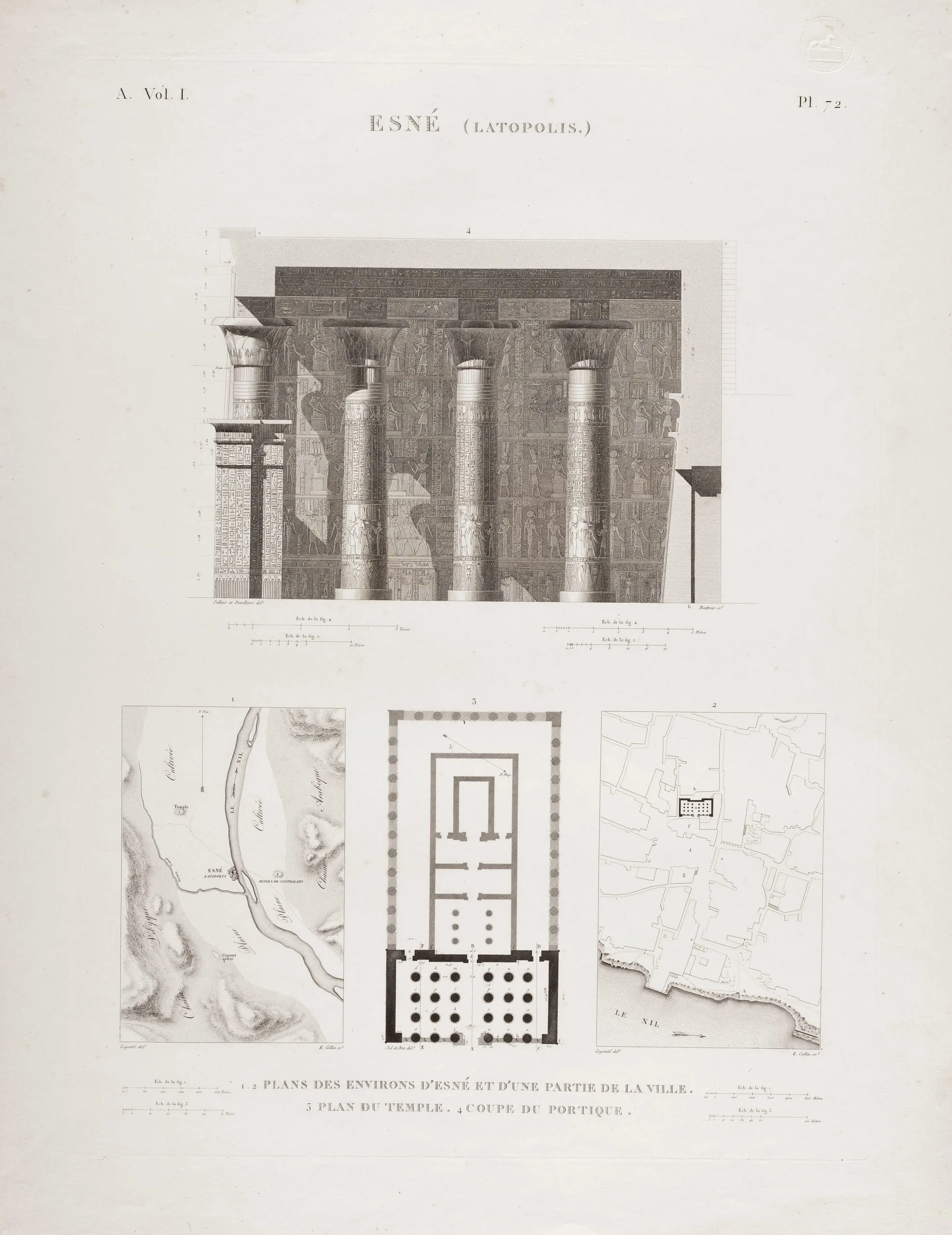 - Esné (Latopolis). 1.-2. Plans des environs d'esné et d'une partie de la ville. 3. Plan du temple. 4. Coupe du portique.
