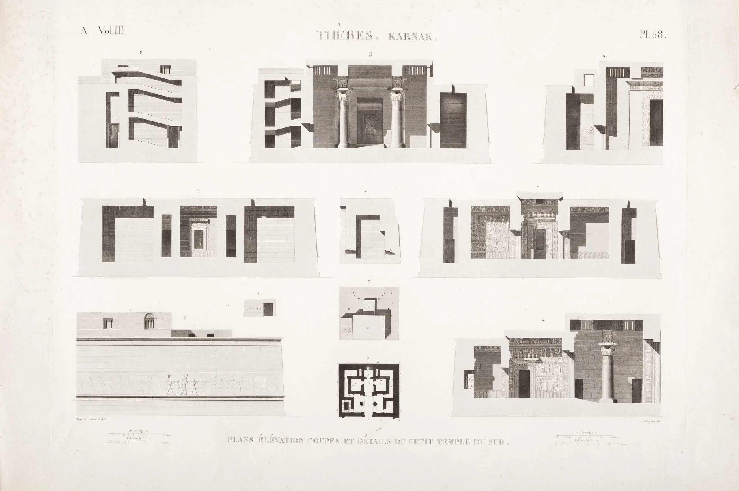 - Thèbes, Karnak. Plans élévations coupes et détails du petit temple du sud.