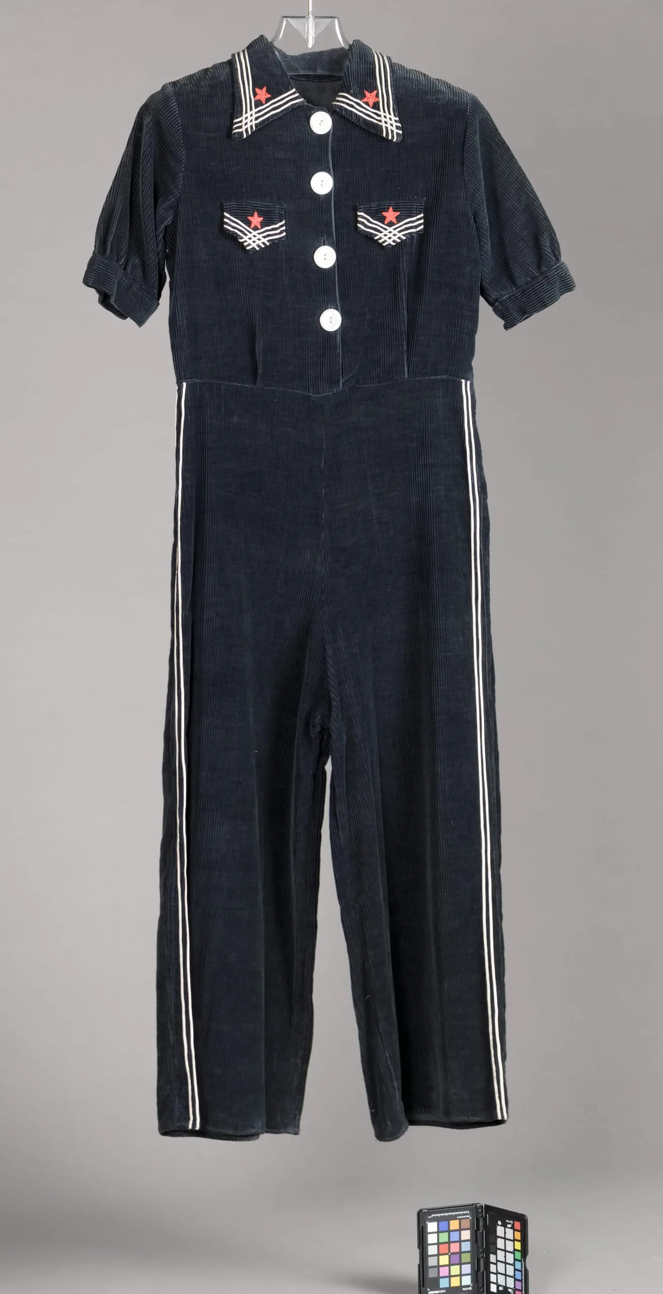 - Cotton velvet (corduroy), cotton and rayon cord trim, embroidered appliques, and plastic buttons.