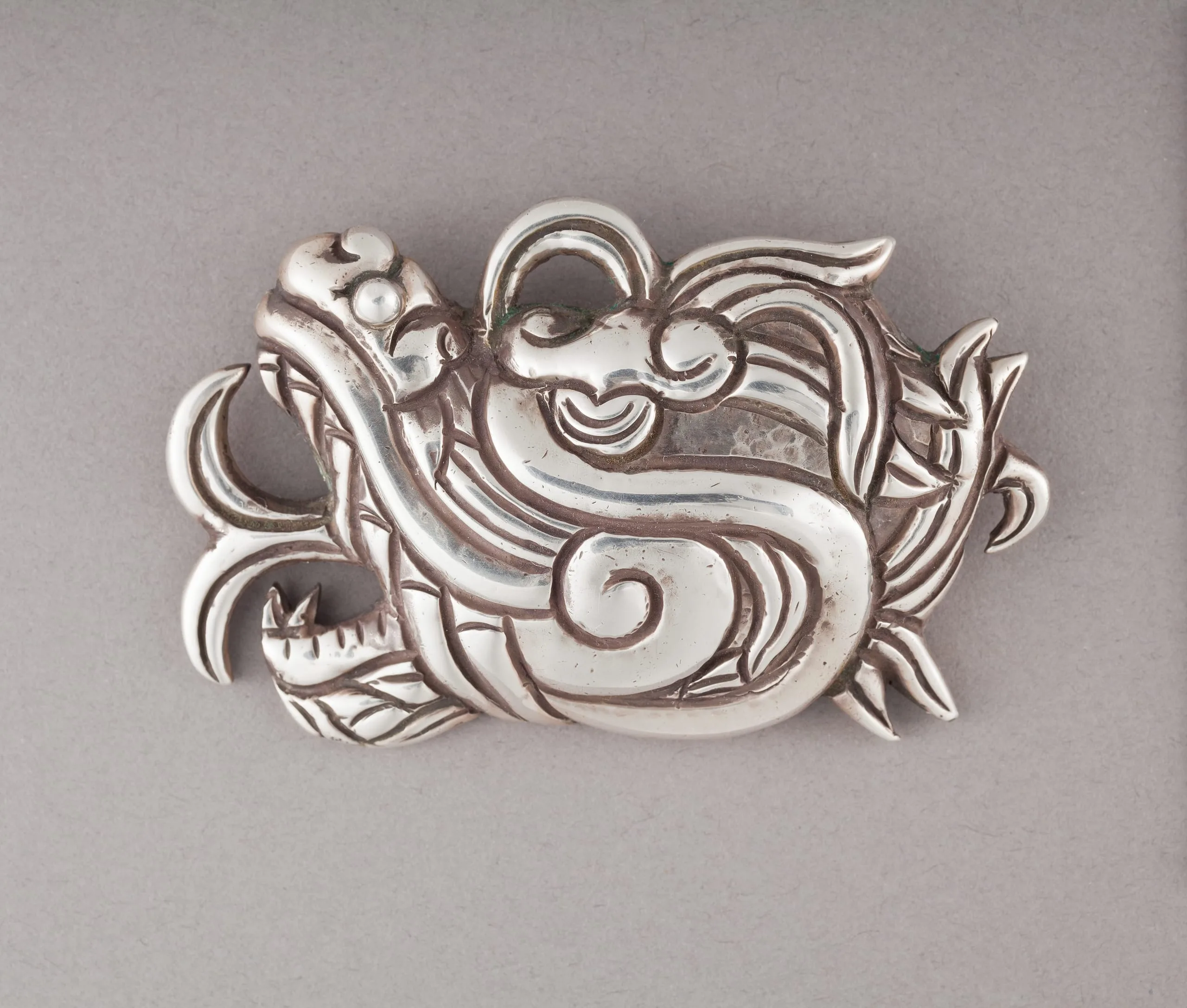 This brooch is inspired by a famous basalt feathered-sepent heart bowl of Aztec origin in the collection of the Museo Nacional de Antropología, Mexico City.