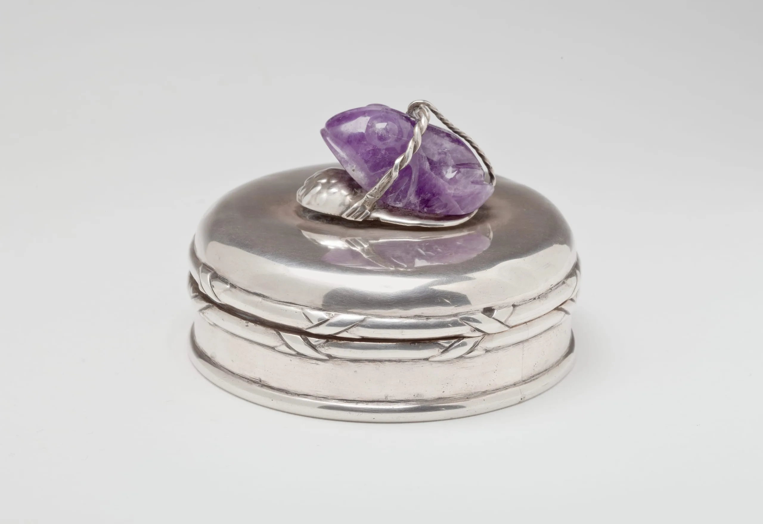 Frederick Walter Davis and William Spratling were the first to introduce the use of amethyst into their silver designs. Amethyst quartz was inexpensive and mined in Mexico. The contrast of the crazed, semi-transparent stone with the shiny, smooth surface of the silver created a dramatic effect.
