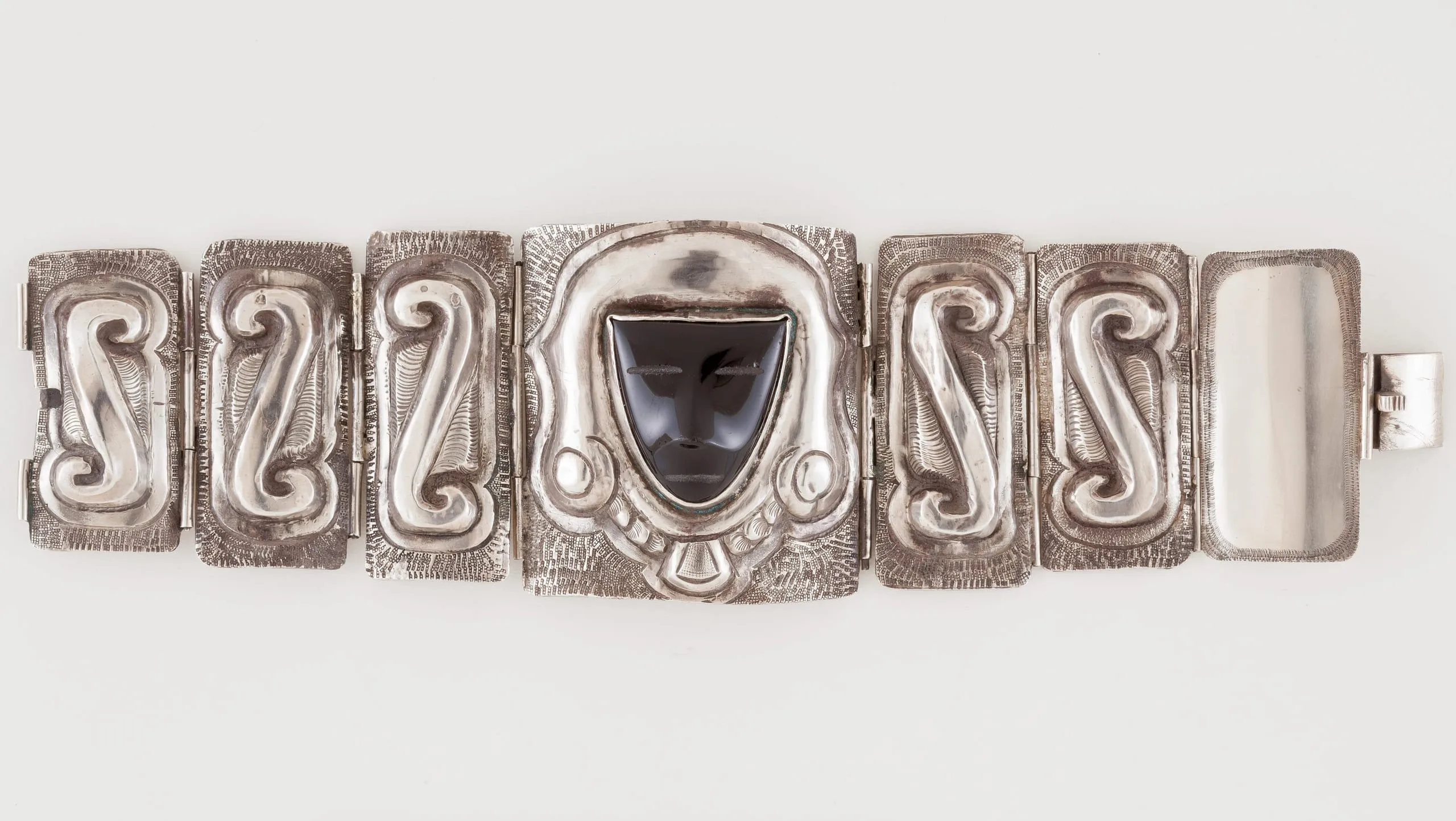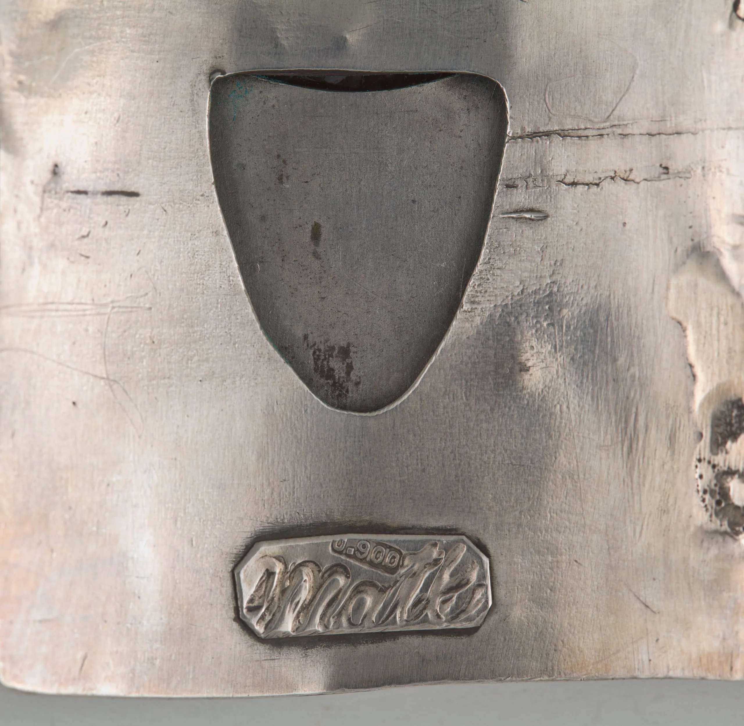 Martilde Poulat, who signed her work "MATL," was a classically trained painter who became a silver designer in 1934. MATL drew inspiration from ancient art and popular traditions. This group of objects references earlier designs introduced by Frederick Walter Davis, who was one of the first to use obsidian and small carved masks mounted in silver. The combination of these materials produced a striking effect that made this type of design highly popular.