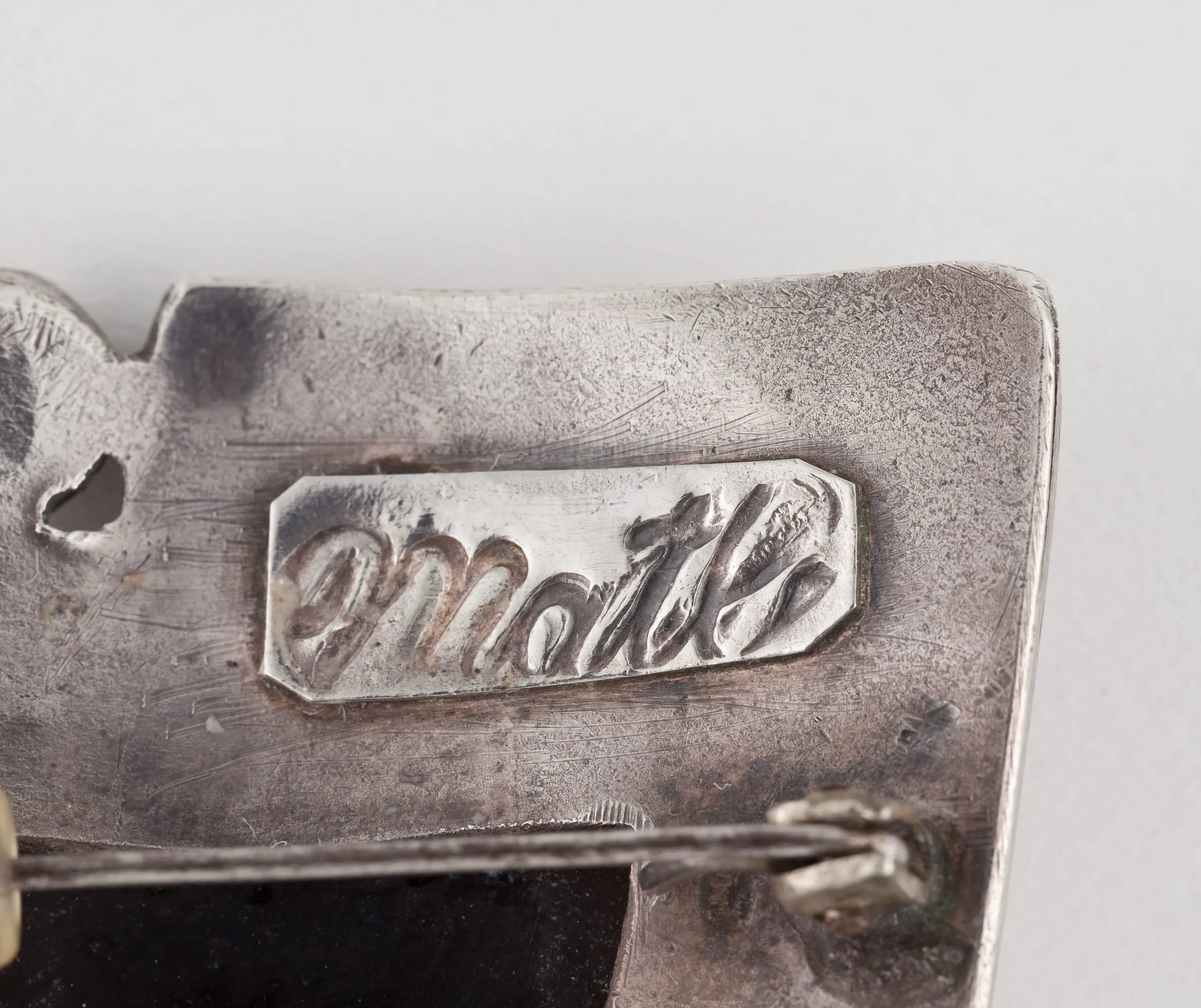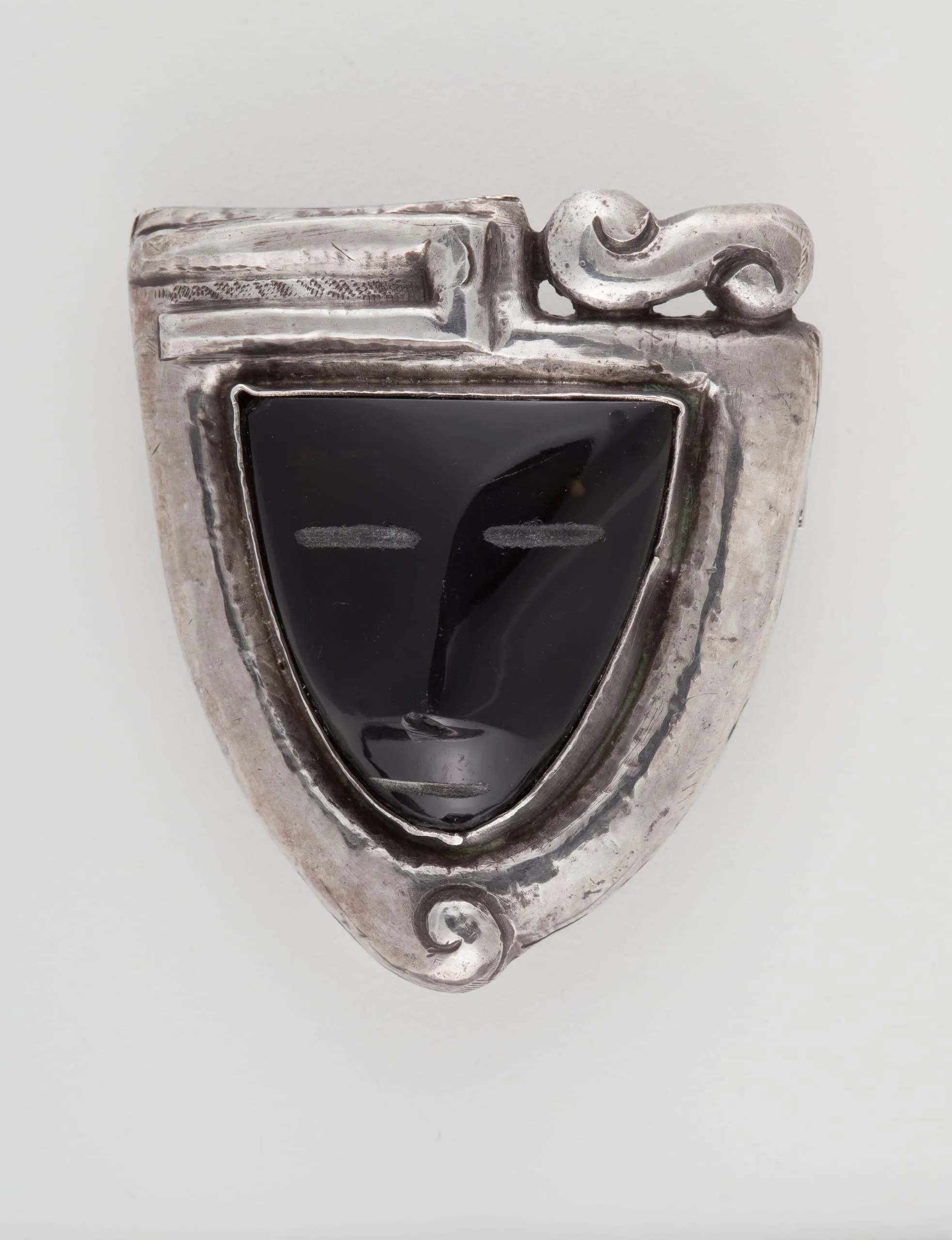 Martilde Poulat, who signed her work "MATL," was a classically trained painter who became a silver designer in 1934. MATL drew inspiration from ancient art and popular traditions. This group of objects references earlier designs introduced by Frederick Walter Davis, who was one of the first to use obsidian and small carved masks mounted in silver. The combination of these materials produced a striking effect that made this type of design highly popular.