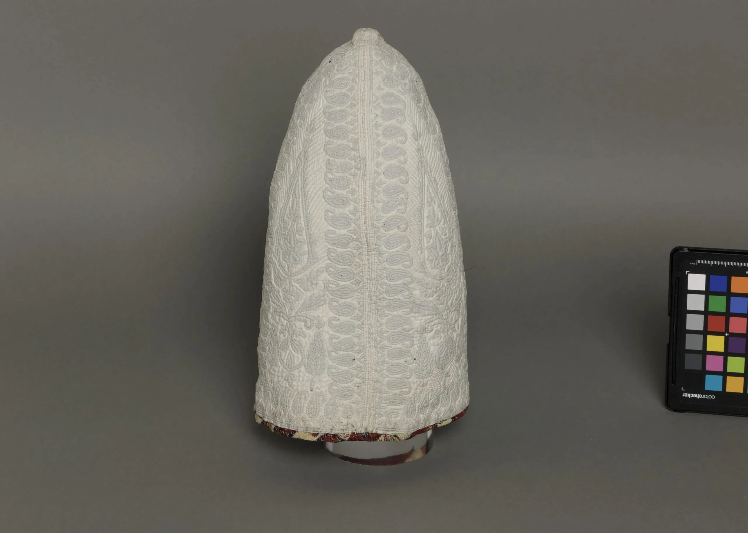 - Cotton plain weave, quilted with wool twill, and goat fleece underdown twill double-interlocking tapestry weave