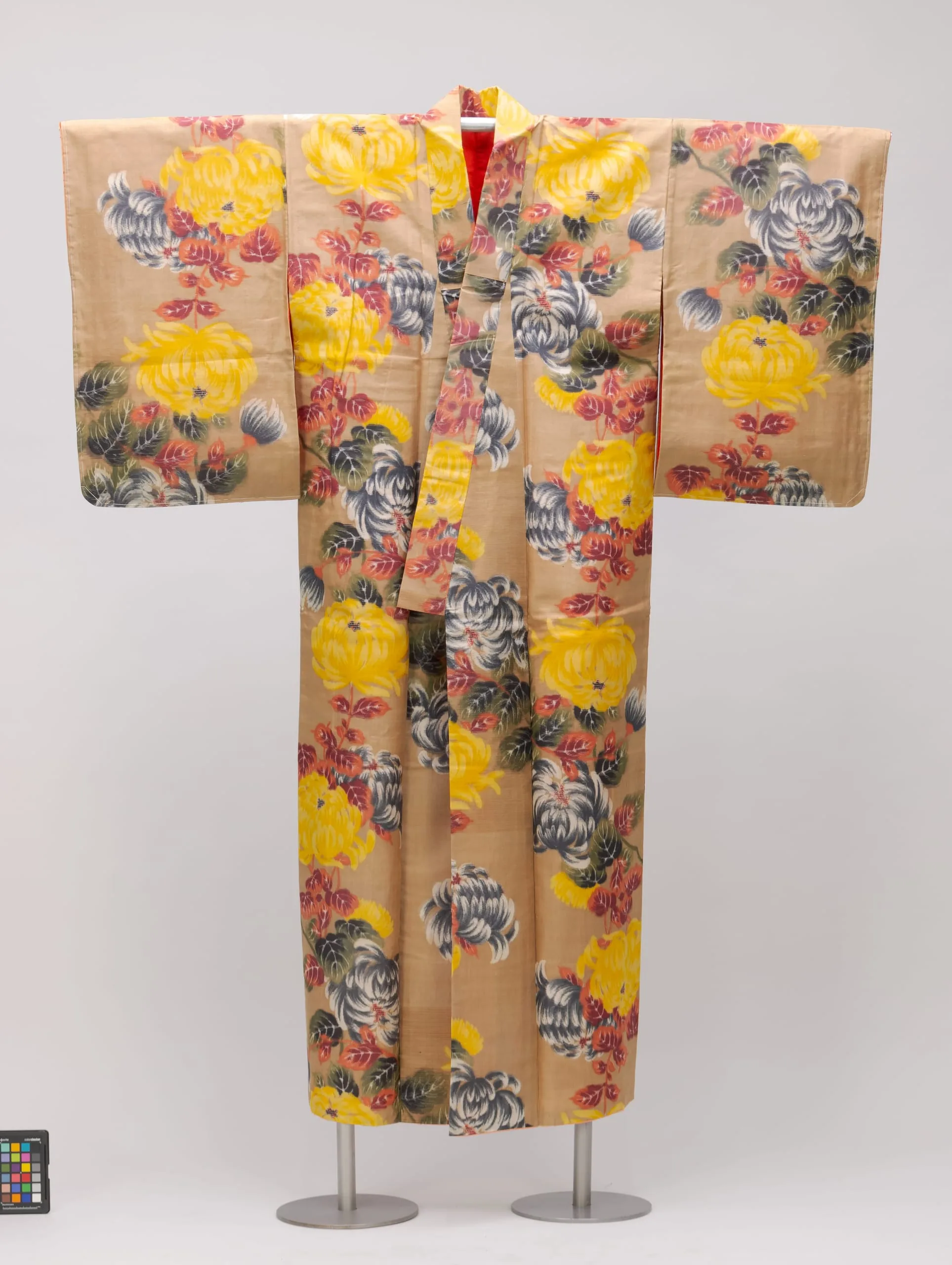 - Silk plain weave with stencil-printed warp and weft (heiyō kasuri meisen); gilt-paperwrapped silk thread supplementary wefts