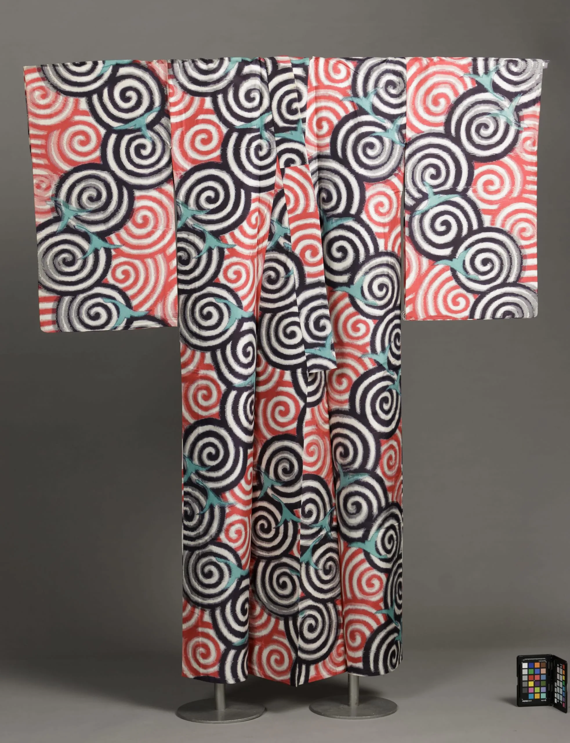 - Woman’s Unlined Kimono (Hitoe) with Spirals and Abstract Birds