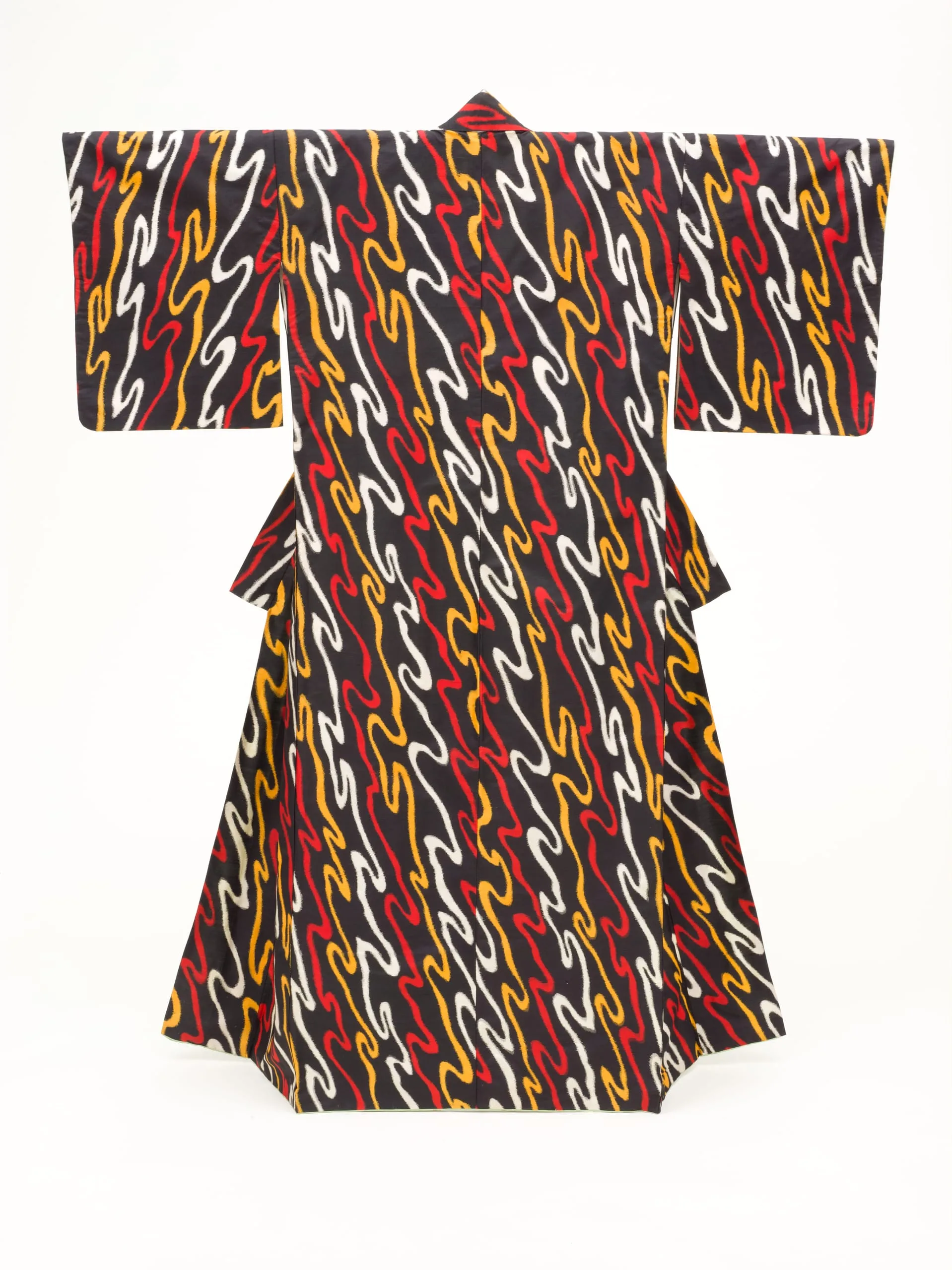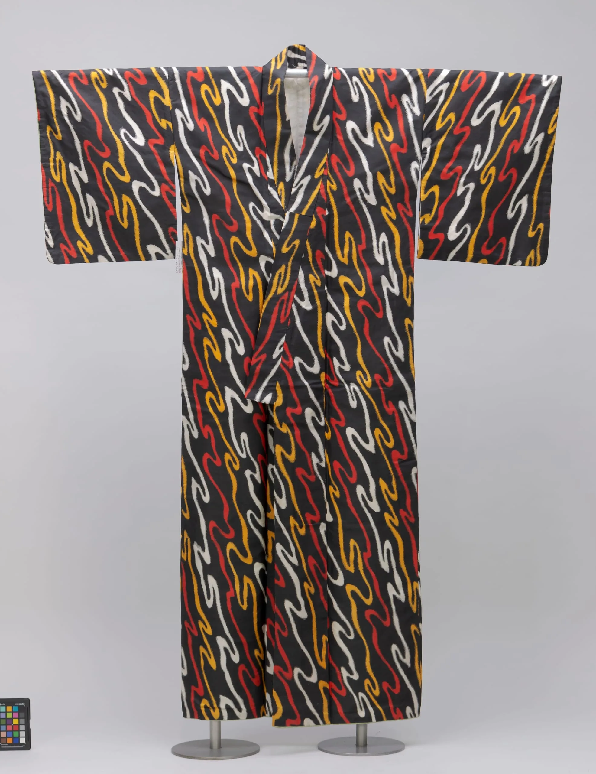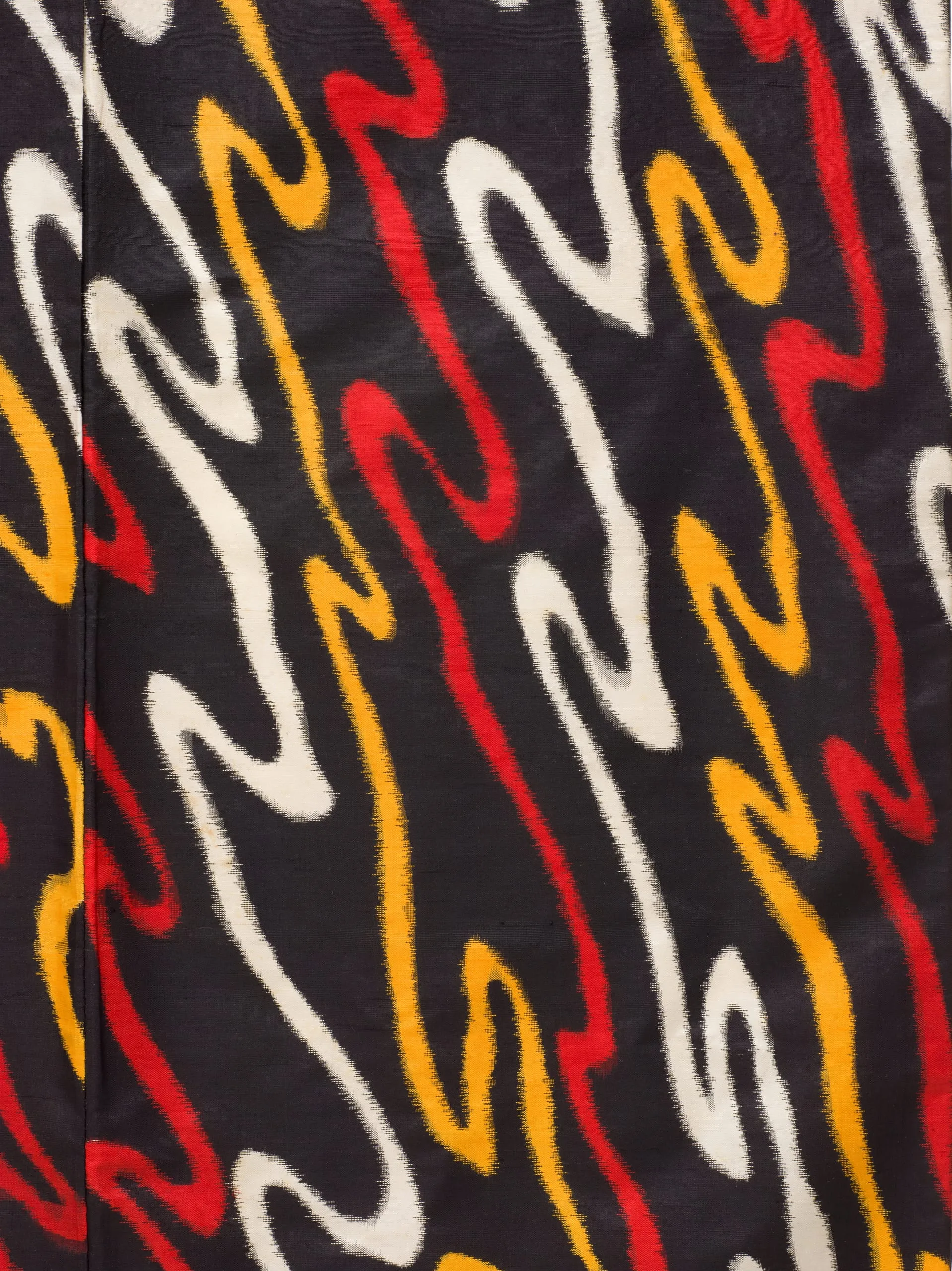 - Silk plain weave, stencil-printed warp and weft (heiyō-gasuri meisen)