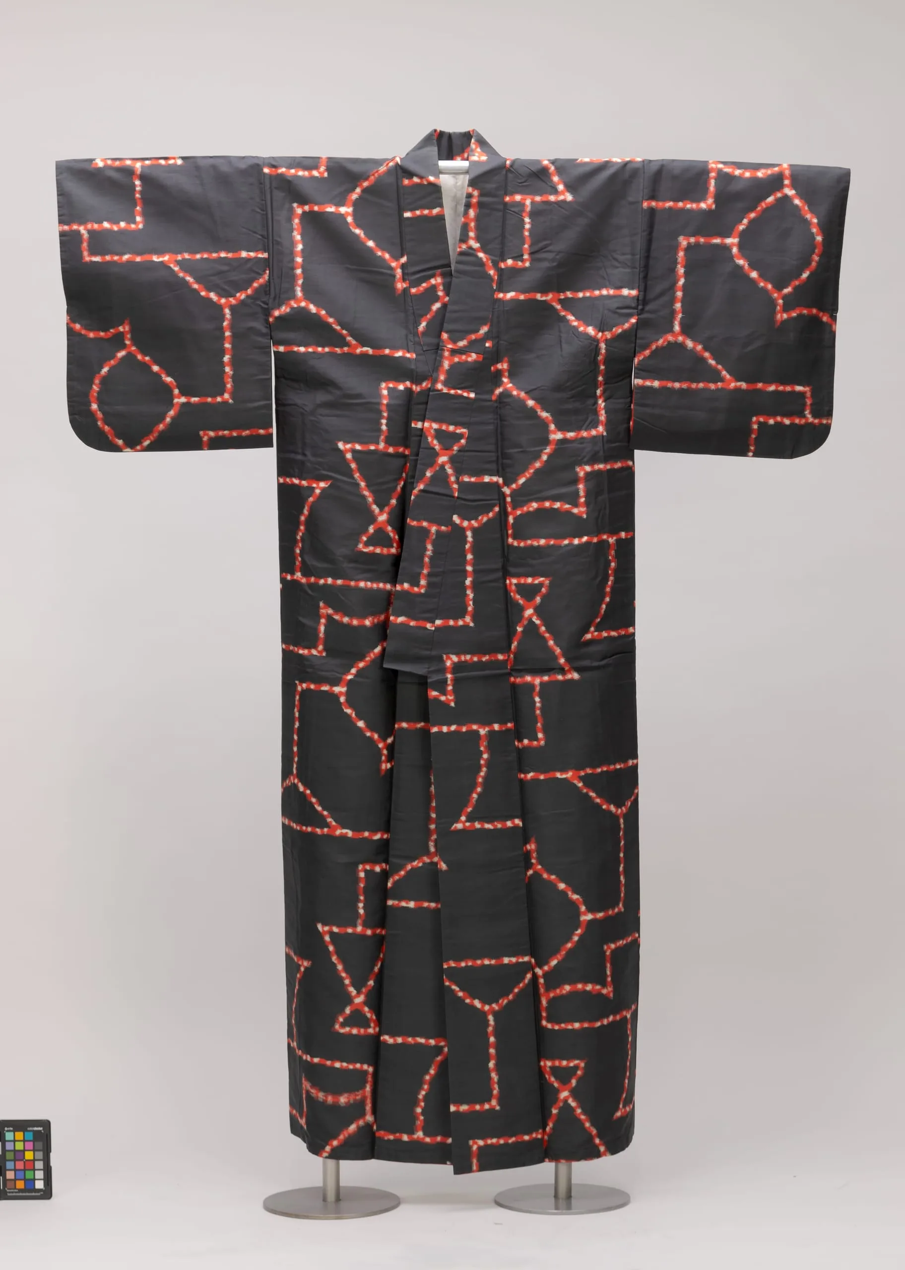 - Silk plain weave, stencil-printed warp and weft (heiyō kasuri meisen)