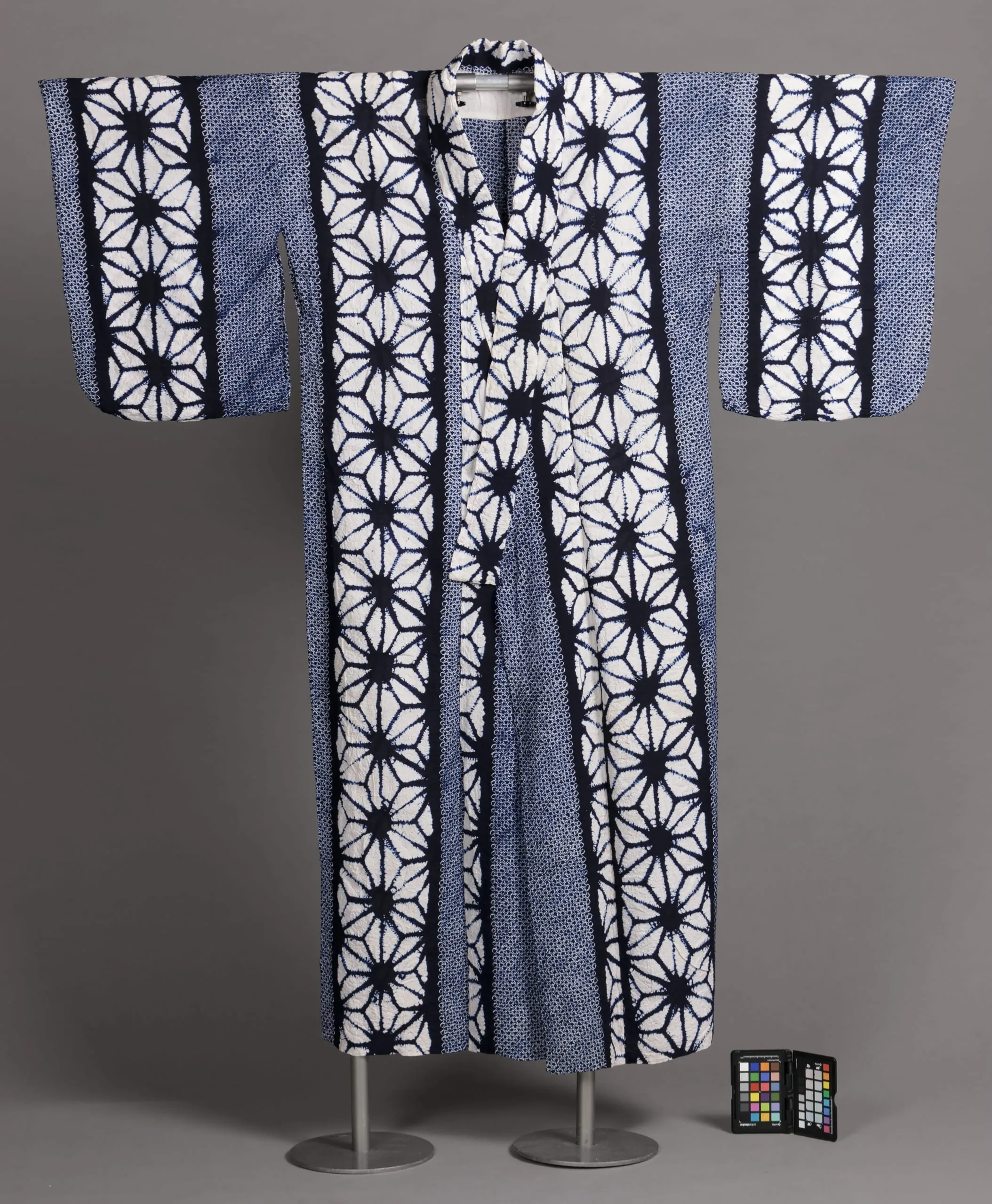 - Woman's Informal Summer Kimono (Yukata) with Vertical Bands of Abstract Hemp-Leaf Pattern (Asa no ha)