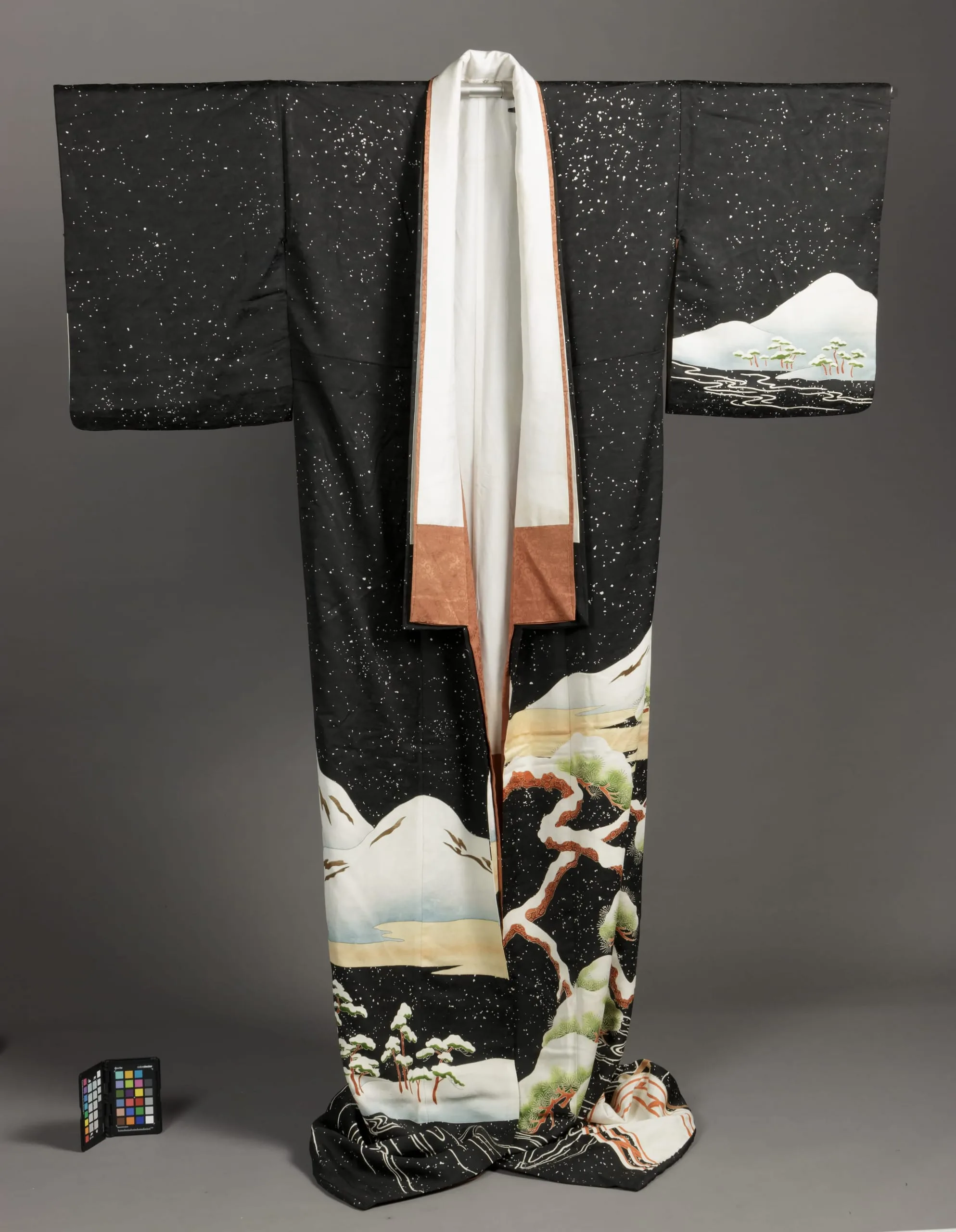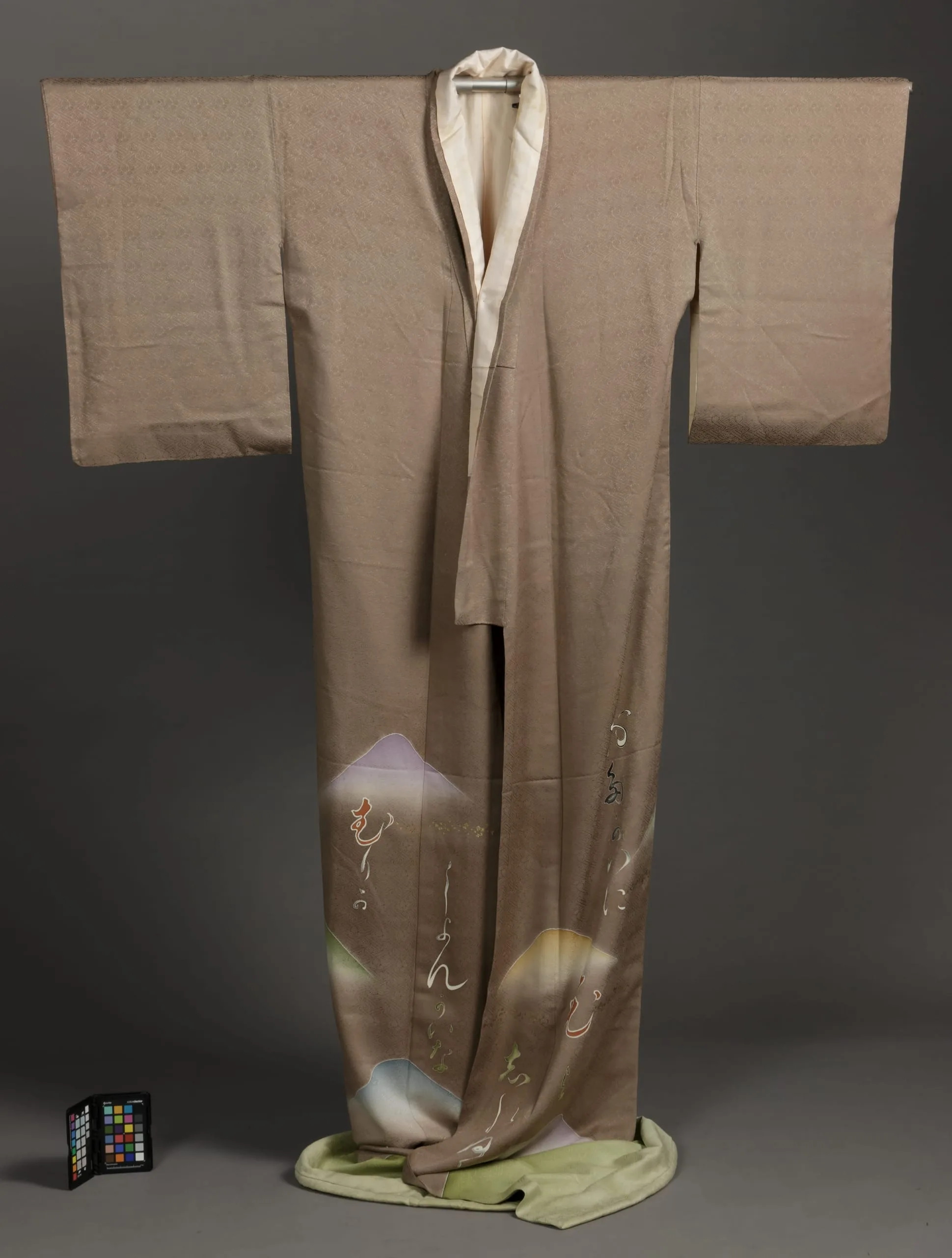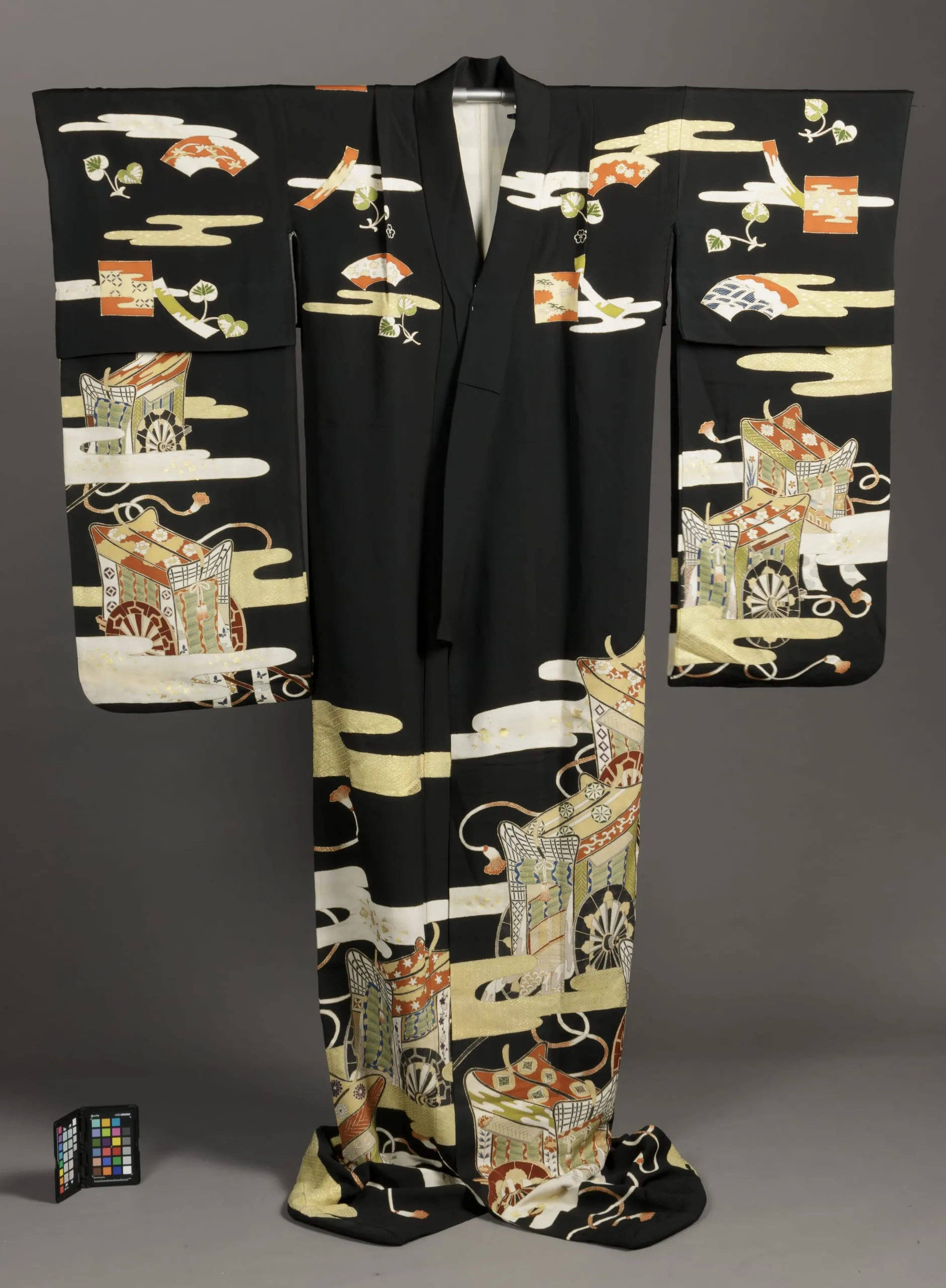 - Outer Kimono: Silk figured twill, paste-resist-dyed (yūzen) and gold leaf