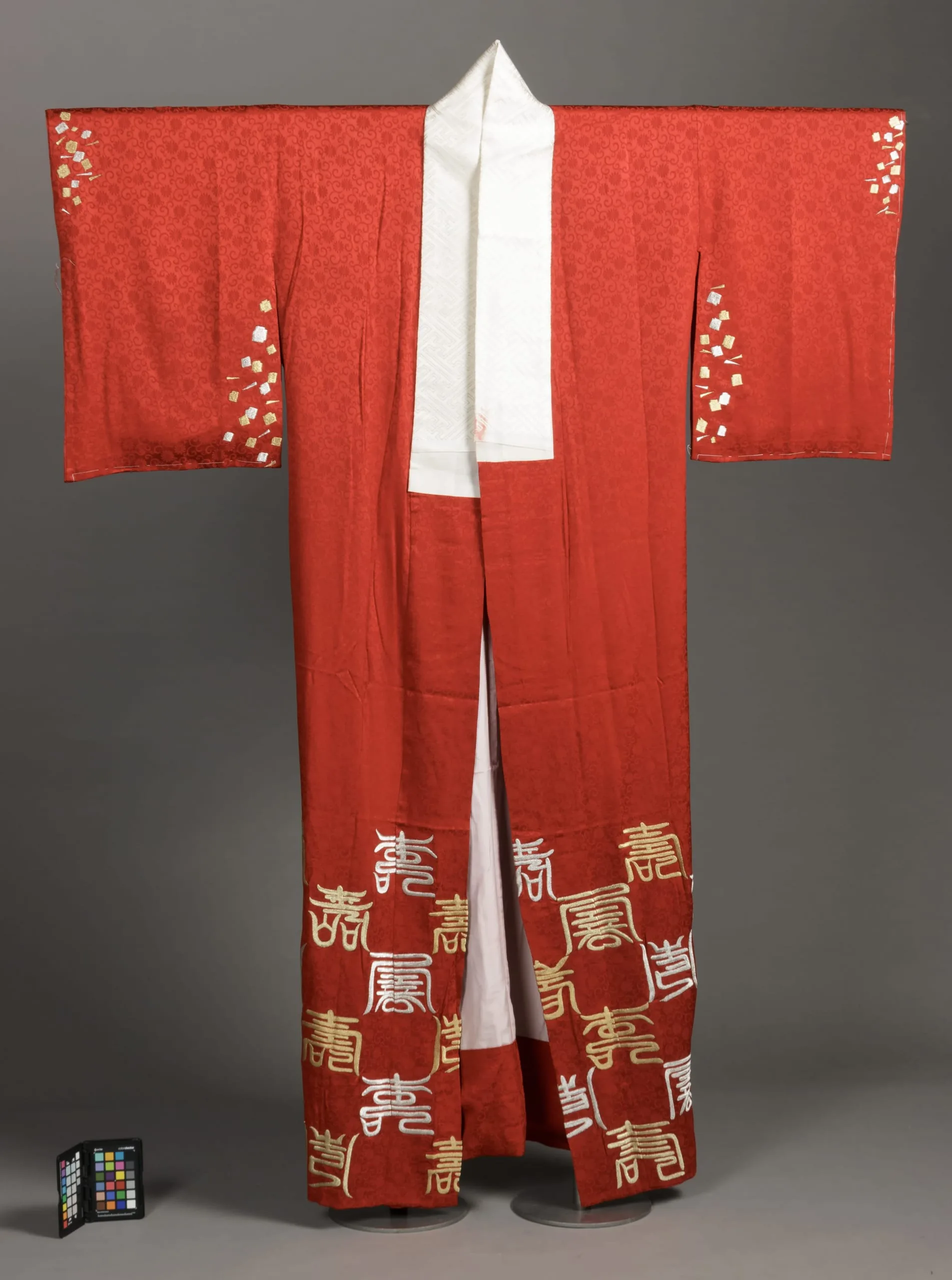 Under Kimono: Silk figured satin (rinzu) with gilt-wrapped silk thread embroidery