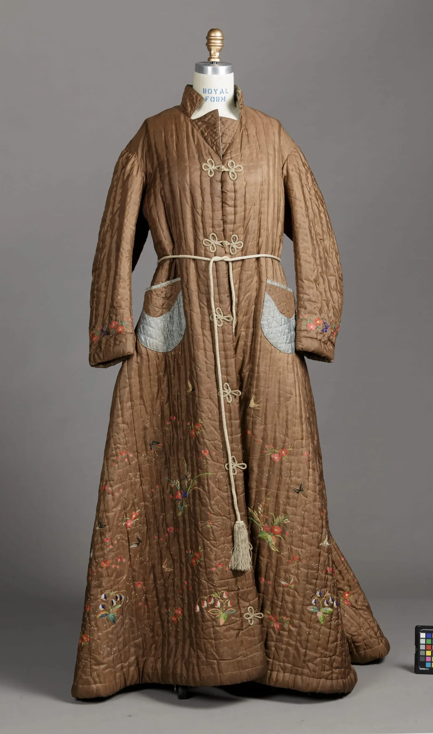 - Robe: Silk plain weave with silk and gilt-paper-wrapped-silk thread embroidery, quilted, silk braid closures. Belt: Silk braid with tassels
