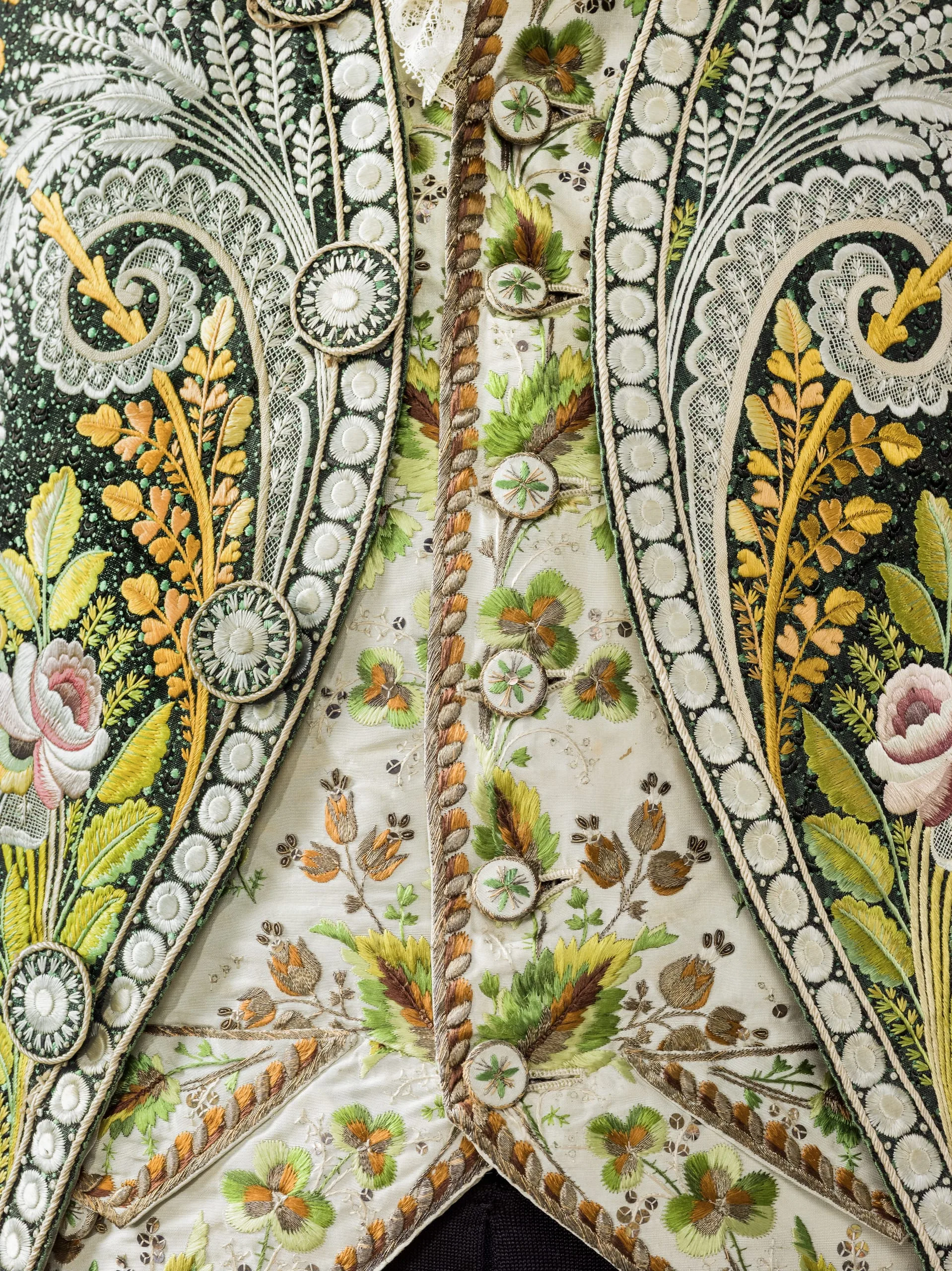 - Silk figured plain weave with silk warp-float and self-weft patterning with silk embroidery