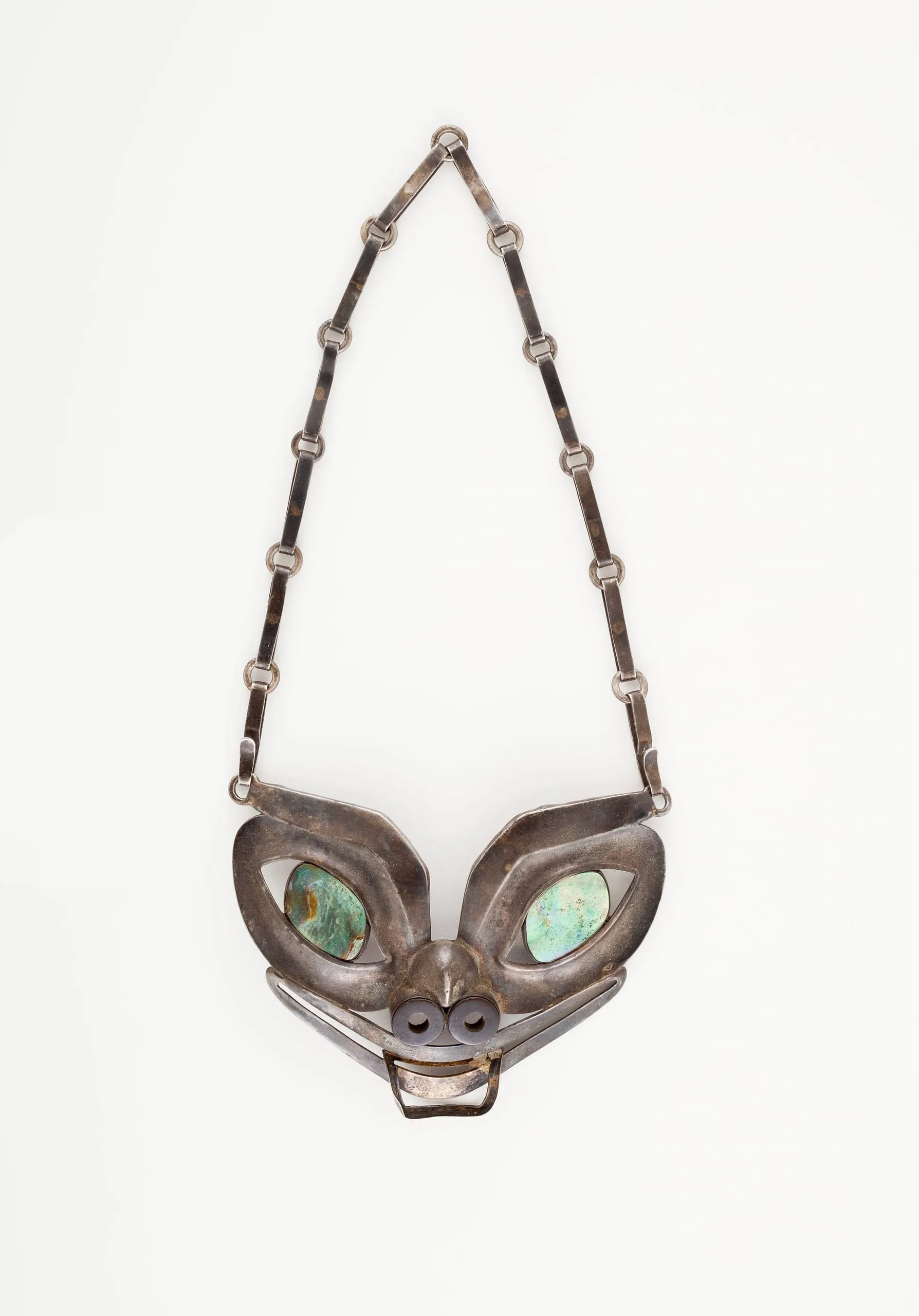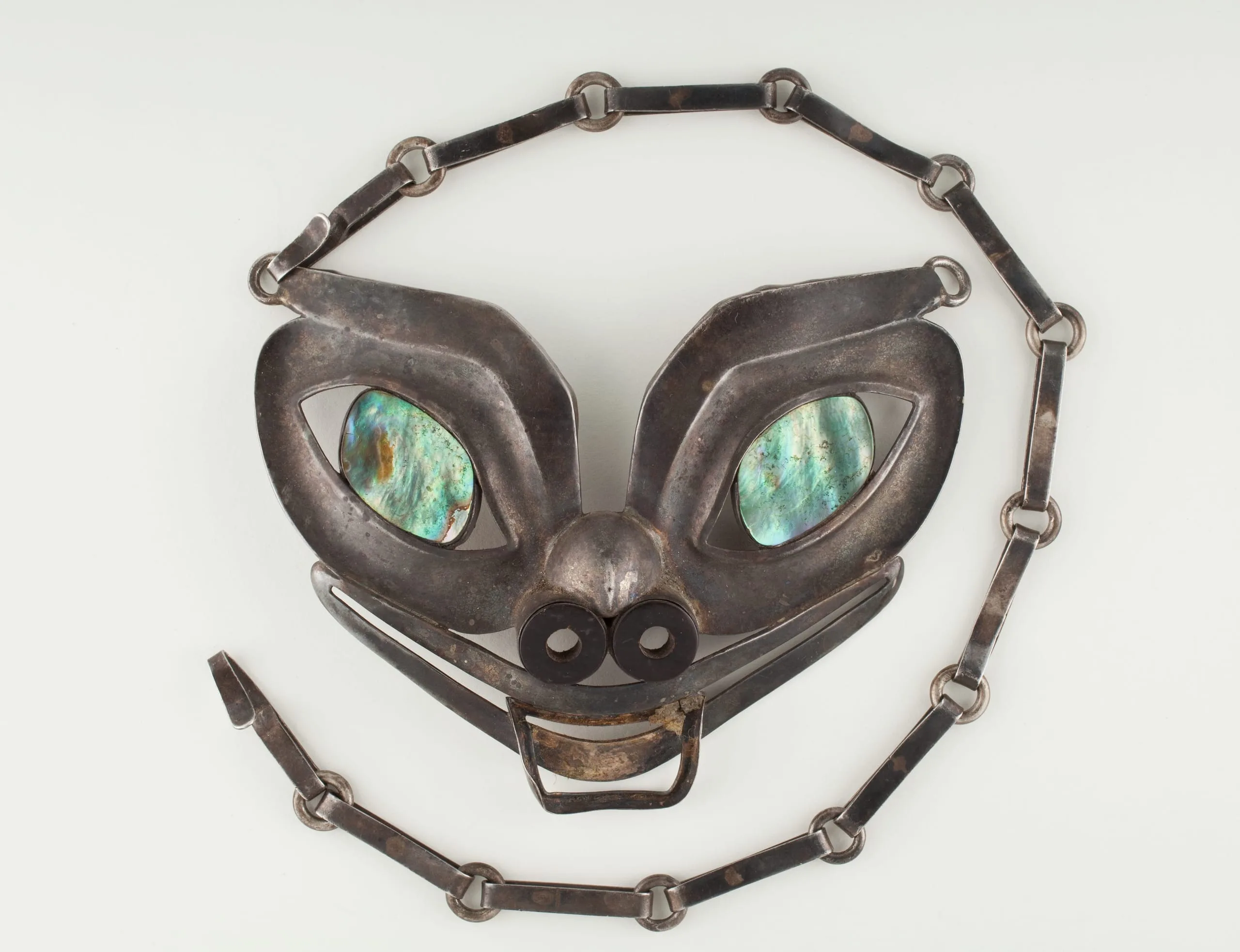 Noting William Spratling's success in Taxco, in 1945 the US Department of the Interior invited him to create a similar crafts industry to revitalize the Alaskan economy and encourage local tribes to develop their artistic talents. By 1949 a group of Alaskan veterans was sent to train at Spratling's workshop in Taxco. Altough Spratling designed two hundred prototypes, Congress abandoned the project. This striking necklace in the form of a Tlingit bear is one of the original prototypes.