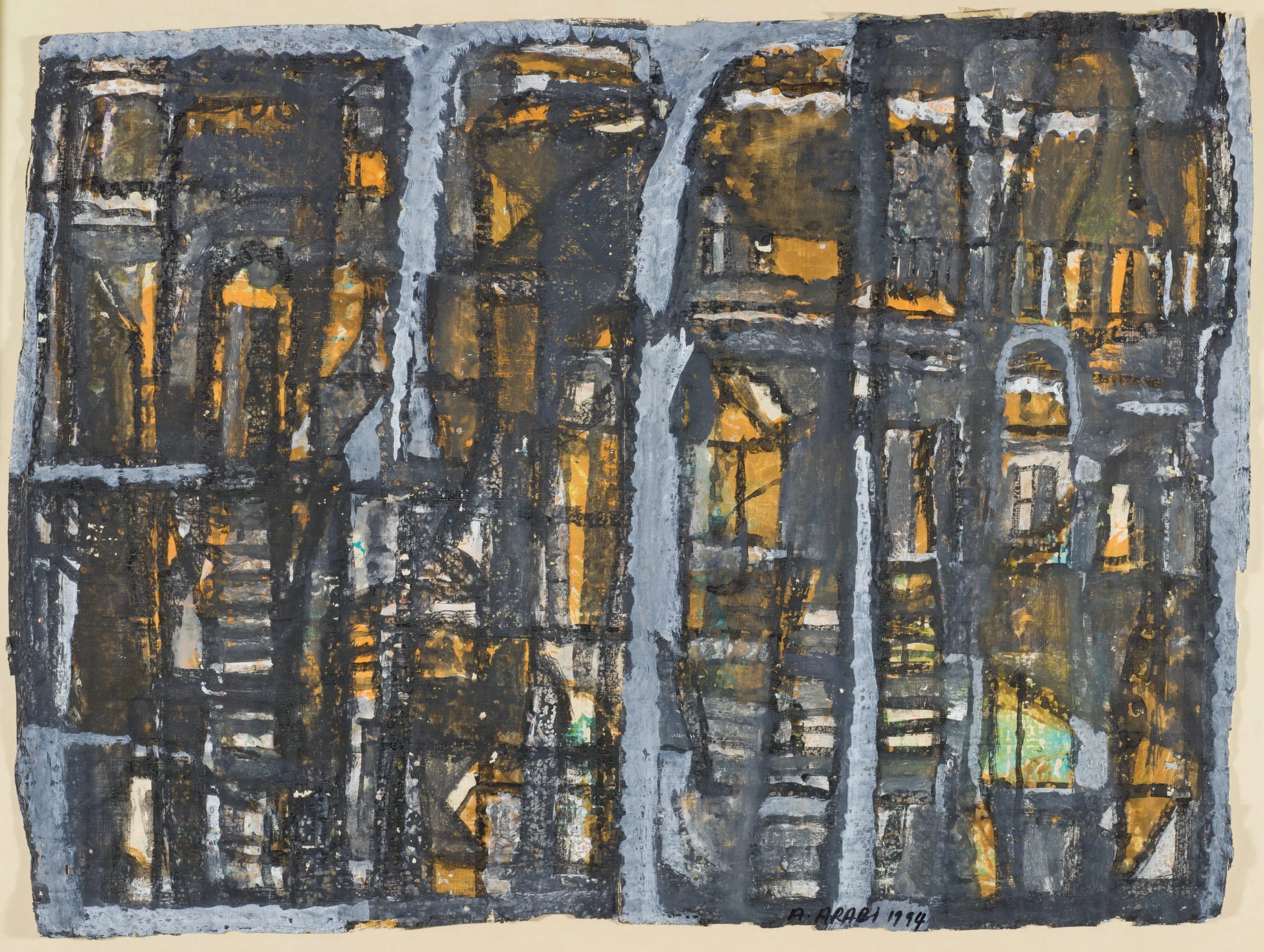 Asaad Arabi belongs to the generation of Syrian artists who came of age during the 1960’s. Born in Damascus in 1941, Arabi lives and works in Paris but he continues to explore the dichotomy of life in Syria through his paintings. These three watercolors are concerned with the hidden world of Damascus and with contrasts and duality, such as those that exist between veiled and unveiled women, and between the exterior and interior of Damascene houses.