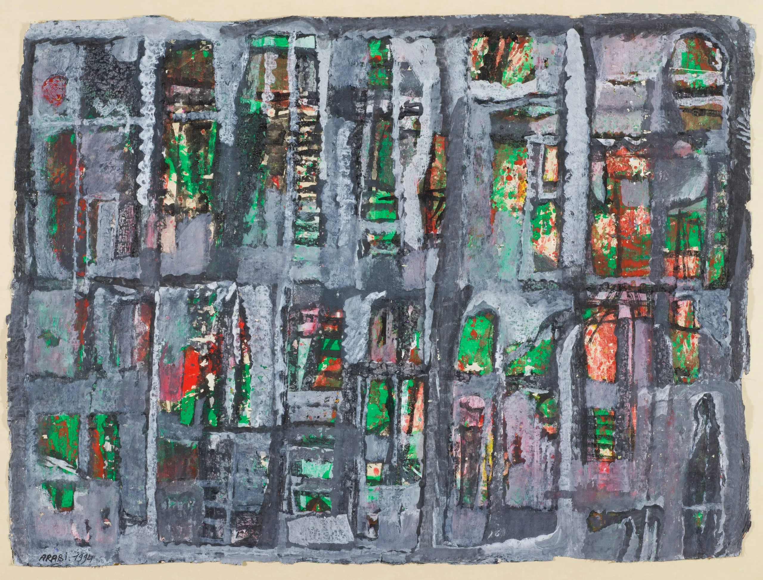 Asaad Arabi belongs to the generation of Syrian artists who came of age during the 1960’s. Born in Damascus in 1941, Arabi lives and works in Paris but he continues to explore the dichotomy of life in Syria through his paintings. These three watercolors are concerned with the hidden world of Damascus and with contrasts and duality, such as those that exist between veiled and unveiled women, and between the exterior and interior of Damascene houses.